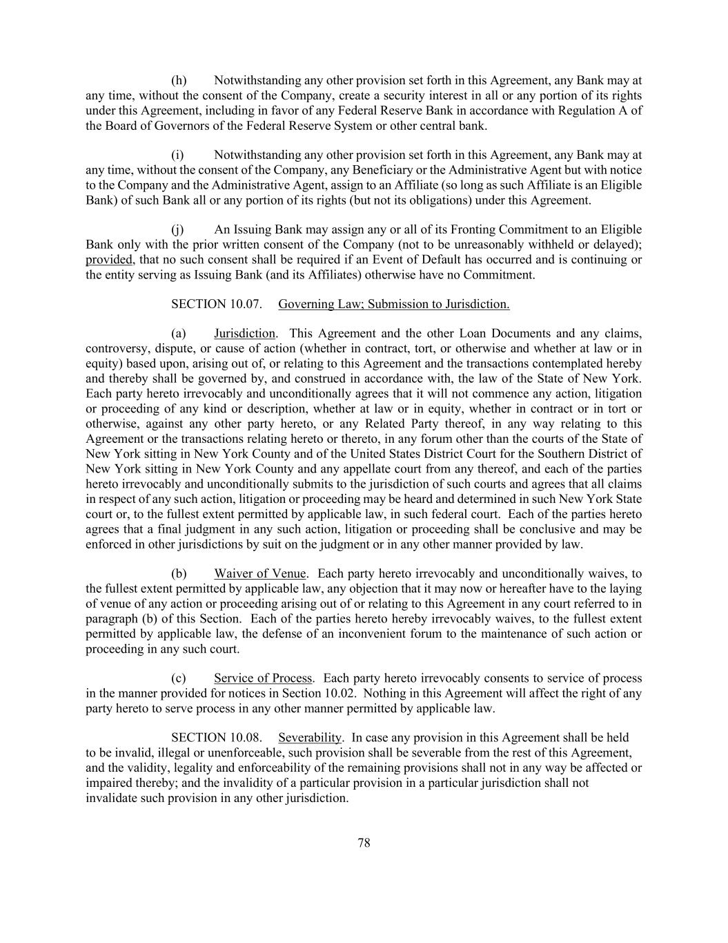 78 (h) Notwithstanding any other provision set forth in this Agreement, any Bank may at any time, without the consent of the Company, create a security interest in all or any portion of its rights under this Agreement, including in favor of any Federal Reserve Bank in accordance with Regulation A of the Board of Governors of the Federal Reserve System or other central bank. (i) Notwithstanding any other provision set forth in this Agreement, any Bank may at any time, without the consent of the Company, any Beneficiary or the Administrative Agent but with notice to the Company and the Administrative Agent, assign to an Affiliate (so long as such Affiliate is an Eligible Bank) of such Bank all or any portion of its rights (but not its obligations) under this Agreement. (j) An Issuing Bank may assign any or all of its Fronting Commitment to an Eligible Bank only with the prior written consent of the Company (not to be unreasonably withheld or delayed); provided, that no such consent shall be required if an Event of Default has occurred and is continuing or the entity serving as Issuing Bank (and its Affiliates) otherwise have no Commitment. SECTION 10.07. Governing Law; Submission to Jurisdiction. (a) Jurisdiction. This Agreement and the other Loan Documents and any claims, controversy, dispute, or cause of action (whether in contract, tort, or otherwise and whether at law or in equity) based upon, arising out of, or relating to this Agreement and the transactions contemplated hereby and thereby shall be governed by, and construed in accordance with, the law of the State of New York. Each party hereto irrevocably and unconditionally agrees that it will not commence any action, litigation or proceeding of any kind or description, whether at law or in equity, whether in contract or in tort or otherwise, against any other party hereto, or any Related Party thereof, in any way relating to this Agreement or the transactions relating hereto or thereto, in any forum other than the courts of the State of New York sitting in New York County and of the United States District Court for the Southern District of New York sitting in New York County and any appellate court from any thereof, and each of the parties hereto irrevocably and unconditionally submits to the jurisdiction of such courts and agrees that all claims in respect of any such action, litigation or proceeding may be heard and determined in such New York State court or, to the fullest extent permitted by applicable law, in such federal court. Each of the parties hereto agrees that a final judgment in any such action, litigation or proceeding shall be conclusive and may be enforced in other jurisdictions by suit on the judgment or in any other manner provided by law. (b) Waiver of Venue. Each party hereto irrevocably and unconditionally waives, to the fullest extent permitted by applicable law, any objection that it may now or hereafter have to the laying of venue of any action or proceeding arising out of or relating to this Agreement in any court referred to in paragraph (b) of this Section. Each of the parties hereto hereby irrevocably waives, to the fullest extent permitted by applicable law, the defense of an inconvenient forum to the maintenance of such action or proceeding in any such court. (c) Service of Process. Each party hereto irrevocably consents to service of process in the manner provided for notices in Section 10.02. Nothing in this Agreement will affect the right of any party hereto to serve process in any other manner permitted by applicable law. SECTION 10.08. Severability. In case any provision in this Agreement shall be held to be invalid, illegal or unenforceable, such provision shall be severable from the rest of this Agreement, and the validity, legality and enforceability of the remaining provisions shall not in any way be affected or impaired thereby; and the invalidity of a particular provision in a particular jurisdiction shall not invalidate such provision in any other jurisdiction.