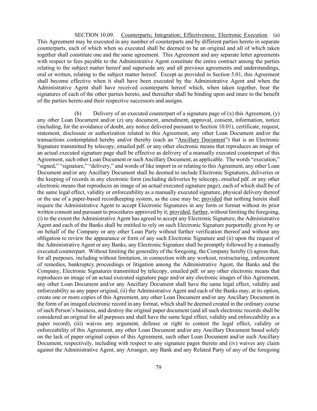 79 SECTION 10.09. Counterparts; Integration; Effectiveness; Electronic Execution. (a) This Agreement may be executed in any number of counterparts and by different parties hereto in separate counterparts, each of which when so executed shall be deemed to be an original and all of which taken together shall constitute one and the same agreement. This Agreement and any separate letter agreements with respect to fees payable to the Administrative Agent constitute the entire contract among the parties relating to the subject matter hereof and supersede any and all previous agreements and understandings, oral or written, relating to the subject matter hereof. Except as provided in Section 5.01, this Agreement shall become effective when it shall have been executed by the Administrative Agent and when the Administrative Agent shall have received counterparts hereof which, when taken together, bear the signatures of each of the other parties hereto, and thereafter shall be binding upon and inure to the benefit of the parties hereto and their respective successors and assigns. (b) Delivery of an executed counterpart of a signature page of (x) this Agreement, (y) any other Loan Document and/or (z) any document, amendment, approval, consent, information, notice (including, for the avoidance of doubt, any notice delivered pursuant to Section 10.01), certificate, request, statement, disclosure or authorization related to this Agreement, any other Loan Document and/or the transactions contemplated hereby and/or thereby (each an “Ancillary Document”) that is an Electronic Signature transmitted by telecopy, emailed pdf. or any other electronic means that reproduces an image of an actual executed signature page shall be effective as delivery of a manually executed counterpart of this Agreement, such other Loan Document or such Ancillary Document, as applicable. The words “execution,” “signed,” “signature,” “delivery,” and words of like import in or relating to this Agreement, any other Loan Document and/or any Ancillary Document shall be deemed to include Electronic Signatures, deliveries or the keeping of records in any electronic form (including deliveries by telecopy, emailed pdf. or any other electronic means that reproduces an image of an actual executed signature page), each of which shall be of the same legal effect, validity or enforceability as a manually executed signature, physical delivery thereof or the use of a paper-based recordkeeping system, as the case may be; provided that nothing herein shall require the Administrative Agent to accept Electronic Signatures in any form or format without its prior written consent and pursuant to procedures approved by it; provided, further, without limiting the foregoing, (i) to the extent the Administrative Agent has agreed to accept any Electronic Signature, the Administrative Agent and each of the Banks shall be entitled to rely on such Electronic Signature purportedly given by or on behalf of the Company or any other Loan Party without further verification thereof and without any obligation to review the appearance or form of any such Electronic Signature and (ii) upon the request of the Administrative Agent or any Banks, any Electronic Signature shall be promptly followed by a manually executed counterpart. Without limiting the generality of the foregoing, the Company hereby (i) agrees that, for all purposes, including without limitation, in connection with any workout, restructuring, enforcement of remedies, bankruptcy proceedings or litigation among the Administrative Agent, the Banks and the Company, Electronic Signatures transmitted by telecopy, emailed pdf. or any other electronic means that reproduces an image of an actual executed signature page and/or any electronic images of this Agreement, any other Loan Document and/or any Ancillary Document shall have the same legal effect, validity and enforceability as any paper original, (ii) the Administrative Agent and each of the Banks may, at its option, create one or more copies of this Agreement, any other Loan Document and/or any Ancillary Document in the form of an imaged electronic record in any format, which shall be deemed created in the ordinary course of such Person’s business, and destroy the original paper document (and all such electronic records shall be considered an original for all purposes and shall have the same legal effect, validity and enforceability as a paper record), (iii) waives any argument, defense or right to contest the legal effect, validity or enforceability of this Agreement, any other Loan Document and/or any Ancillary Document based solely on the lack of paper original copies of this Agreement, such other Loan Document and/or such Ancillary Document, respectively, including with respect to any signature pages thereto and (iv) waives any claim against the Administrative Agent, any Arranger, any Bank and any Related Party of any of the foregoing