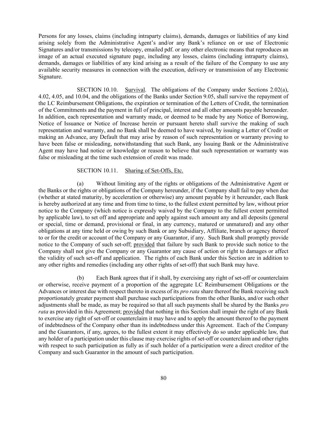 80 Persons for any losses, claims (including intraparty claims), demands, damages or liabilities of any kind arising solely from the Administrative Agent’s and/or any Bank’s reliance on or use of Electronic Signatures and/or transmissions by telecopy, emailed pdf. or any other electronic means that reproduces an image of an actual executed signature page, including any losses, claims (including intraparty claims), demands, damages or liabilities of any kind arising as a result of the failure of the Company to use any available security measures in connection with the execution, delivery or transmission of any Electronic Signature. SECTION 10.10. Survival. The obligations of the Company under Sections 2.02(a), 4.02, 4.05, and 10.04, and the obligations of the Banks under Section 9.05, shall survive the repayment of the LC Reimbursement Obligations, the expiration or termination of the Letters of Credit, the termination of the Commitments and the payment in full of principal, interest and all other amounts payable hereunder. In addition, each representation and warranty made, or deemed to be made by any Notice of Borrowing, Notice of Issuance or Notice of Increase herein or pursuant hereto shall survive the making of such representation and warranty, and no Bank shall be deemed to have waived, by issuing a Letter of Credit or making an Advance, any Default that may arise by reason of such representation or warranty proving to have been false or misleading, notwithstanding that such Bank, any Issuing Bank or the Administrative Agent may have had notice or knowledge or reason to believe that such representation or warranty was false or misleading at the time such extension of credit was made. SECTION 10.11. Sharing of Set-Offs, Etc. (a) Without limiting any of the rights or obligations of the Administrative Agent or the Banks or the rights or obligations of the Company hereunder, if the Company shall fail to pay when due (whether at stated maturity, by acceleration or otherwise) any amount payable by it hereunder, each Bank is hereby authorized at any time and from time to time, to the fullest extent permitted by law, without prior notice to the Company (which notice is expressly waived by the Company to the fullest extent permitted by applicable law), to set off and appropriate and apply against such amount any and all deposits (general or special, time or demand, provisional or final, in any currency, matured or unmatured) and any other obligations at any time held or owing by such Bank or any Subsidiary, Affiliate, branch or agency thereof to or for the credit or account of the Company or any Guarantor, if any. Such Bank shall promptly provide notice to the Company of such set-off; provided that failure by such Bank to provide such notice to the Company shall not give the Company or any Guarantor any cause of action or right to damages or affect the validity of such set-off and application. The rights of each Bank under this Section are in addition to any other rights and remedies (including any other rights of set-off) that such Bank may have. (b) Each Bank agrees that if it shall, by exercising any right of set-off or counterclaim or otherwise, receive payment of a proportion of the aggregate LC Reimbursement Obligations or the Advances or interest due with respect thereto in excess of its pro rata share thereof the Bank receiving such proportionately greater payment shall purchase such participations from the other Banks, and/or such other adjustments shall be made, as may be required so that all such payments shall be shared by the Banks pro rata as provided in this Agreement; provided that nothing in this Section shall impair the right of any Bank to exercise any right of set-off or counterclaim it may have and to apply the amount thereof to the payment of indebtedness of the Company other than its indebtedness under this Agreement. Each of the Company and the Guarantors, if any, agrees, to the fullest extent it may effectively do so under applicable law, that any holder of a participation under this clause may exercise rights of set-off or counterclaim and other rights with respect to such participation as fully as if such holder of a participation were a direct creditor of the Company and such Guarantor in the amount of such participation.