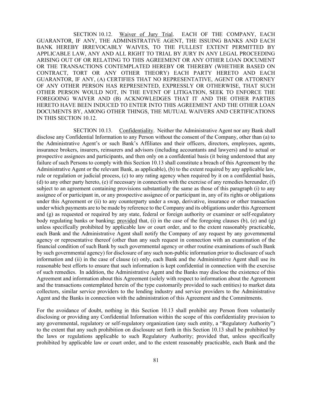 81 SECTION 10.12. Waiver of Jury Trial. EACH OF THE COMPANY, EACH GUARANTOR, IF ANY, THE ADMINISTRATIVE AGENT, THE ISSUING BANKS AND EACH BANK HEREBY IRREVOCABLY WAIVES, TO THE FULLEST EXTENT PERMITTED BY APPLICABLE LAW, ANY AND ALL RIGHT TO TRIAL BY JURY IN ANY LEGAL PROCEEDING ARISING OUT OF OR RELATING TO THIS AGREEMENT OR ANY OTHER LOAN DOCUMENT OR THE TRANSACTIONS CONTEMPLATED HEREBY OR THEREBY (WHETHER BASED ON CONTRACT, TORT OR ANY OTHER THEORY) EACH PARTY HERETO AND EACH GUARANTOR, IF ANY, (A) CERTIFIES THAT NO REPRESENTATIVE, AGENT OR ATTORNEY OF ANY OTHER PERSON HAS REPRESENTED, EXPRESSLY OR OTHERWISE, THAT SUCH OTHER PERSON WOULD NOT, IN THE EVENT OF LITIGATION, SEEK TO ENFORCE THE FOREGOING WAIVER AND (B) ACKNOWLEDGES THAT IT AND THE OTHER PARTIES HERETO HAVE BEEN INDUCED TO ENTER INTO THIS AGREEMENT AND THE OTHER LOAN DOCUMENTS BY, AMONG OTHER THINGS, THE MUTUAL WAIVERS AND CERTIFICATIONS IN THIS SECTION 10.12. SECTION 10.13. Confidentiality. Neither the Administrative Agent nor any Bank shall disclose any Confidential Information to any Person without the consent of the Company, other than (a) to the Administrative Agent’s or such Bank’s Affiliates and their officers, directors, employees, agents, insurance brokers, insurers, reinsurers and advisors (including accountants and lawyers) and to actual or prospective assignees and participants, and then only on a confidential basis (it being understood that any failure of such Persons to comply with this Section 10.13 shall constitute a breach of this Agreement by the Administrative Agent or the relevant Bank, as applicable), (b) to the extent required by any applicable law, rule or regulation or judicial process, (c) to any rating agency when required by it on a confidential basis, (d) to any other party hereto, (e) if necessary in connection with the exercise of any remedies hereunder, (f) subject to an agreement containing provisions substantially the same as those of this paragraph (i) to any assignee of or participant in, or any prospective assignee of or participant in, any of its rights or obligations under this Agreement or (ii) to any counterparty under a swap, derivative, insurance or other transaction under which payments are to be made by reference to the Company and its obligations under this Agreement and (g) as requested or required by any state, federal or foreign authority or examiner or self-regulatory body regulating banks or banking; provided that, (i) in the case of the foregoing clauses (b), (e) and (g) unless specifically prohibited by applicable law or court order, and to the extent reasonably practicable, each Bank and the Administrative Agent shall notify the Company of any request by any governmental agency or representative thereof (other than any such request in connection with an examination of the financial condition of such Bank by such governmental agency or other routine examinations of such Bank by such governmental agency) for disclosure of any such non-public information prior to disclosure of such information and (ii) in the case of clause (e) only, each Bank and the Administrative Agent shall use its reasonable best efforts to ensure that such information is kept confidential in connection with the exercise of such remedies. In addition, the Administrative Agent and the Banks may disclose the existence of this Agreement and information about this Agreement (solely with respect to information about the Agreement and the transactions contemplated herein of the type customarily provided to such entities) to market data collectors, similar service providers to the lending industry and service providers to the Administrative Agent and the Banks in connection with the administration of this Agreement and the Commitments. For the avoidance of doubt, nothing in this Section 10.13 shall prohibit any Person from voluntarily disclosing or providing any Confidential Information within the scope of this confidentiality provision to any governmental, regulatory or self-regulatory organization (any such entity, a “Regulatory Authority”) to the extent that any such prohibition on disclosure set forth in this Section 10.13 shall be prohibited by the laws or regulations applicable to such Regulatory Authority; provided that, unless specifically prohibited by applicable law or court order, and to the extent reasonably practicable, each Bank and the