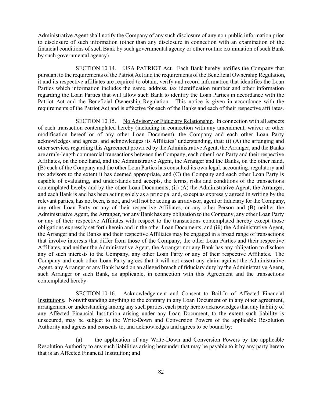 82 Administrative Agent shall notify the Company of any such disclosure of any non-public information prior to disclosure of such information (other than any disclosure in connection with an examination of the financial conditions of such Bank by such governmental agency or other routine examination of such Bank by such governmental agency). SECTION 10.14. USA PATRIOT Act. Each Bank hereby notifies the Company that pursuant to the requirements of the Patriot Act and the requirements of the Beneficial Ownership Regulation, it and its respective affiliates are required to obtain, verify and record information that identifies the Loan Parties which information includes the name, address, tax identification number and other information regarding the Loan Parties that will allow such Bank to identify the Loan Parties in accordance with the Patriot Act and the Beneficial Ownership Regulation. This notice is given in accordance with the requirements of the Patriot Act and is effective for each of the Banks and each of their respective affiliates. SECTION 10.15. No Advisory or Fiduciary Relationship. In connection with all aspects of each transaction contemplated hereby (including in connection with any amendment, waiver or other modification hereof or of any other Loan Document), the Company and each other Loan Party acknowledges and agrees, and acknowledges its Affiliates’ understanding, that: (i) (A) the arranging and other services regarding this Agreement provided by the Administrative Agent, the Arranger, and the Banks are arm’s-length commercial transactions between the Company, each other Loan Party and their respective Affiliates, on the one hand, and the Administrative Agent, the Arranger and the Banks, on the other hand, (B) each of the Company and the other Loan Parties has consulted its own legal, accounting, regulatory and tax advisors to the extent it has deemed appropriate, and (C) the Company and each other Loan Party is capable of evaluating, and understands and accepts, the terms, risks and conditions of the transactions contemplated hereby and by the other Loan Documents; (ii) (A) the Administrative Agent, the Arranger, and each Bank is and has been acting solely as a principal and, except as expressly agreed in writing by the relevant parties, has not been, is not, and will not be acting as an advisor, agent or fiduciary for the Company, any other Loan Party or any of their respective Affiliates, or any other Person and (B) neither the Administrative Agent, the Arranger, nor any Bank has any obligation to the Company, any other Loan Party or any of their respective Affiliates with respect to the transactions contemplated hereby except those obligations expressly set forth herein and in the other Loan Documents; and (iii) the Administrative Agent, the Arranger and the Banks and their respective Affiliates may be engaged in a broad range of transactions that involve interests that differ from those of the Company, the other Loan Parties and their respective Affiliates, and neither the Administrative Agent, the Arranger nor any Bank has any obligation to disclose any of such interests to the Company, any other Loan Party or any of their respective Affiliates. The Company and each other Loan Party agrees that it will not assert any claim against the Administrative Agent, any Arranger or any Bank based on an alleged breach of fiduciary duty by the Administrative Agent, such Arranger or such Bank, as applicable, in connection with this Agreement and the transactions contemplated hereby. SECTION 10.16. Acknowledgement and Consent to Bail-In of Affected Financial Institutions. Notwithstanding anything to the contrary in any Loan Document or in any other agreement, arrangement or understanding among any such parties, each party hereto acknowledges that any liability of any Affected Financial Institution arising under any Loan Document, to the extent such liability is unsecured, may be subject to the Write-Down and Conversion Powers of the applicable Resolution Authority and agrees and consents to, and acknowledges and agrees to be bound by: (a) the application of any Write-Down and Conversion Powers by the applicable Resolution Authority to any such liabilities arising hereunder that may be payable to it by any party hereto that is an Affected Financial Institution; and
