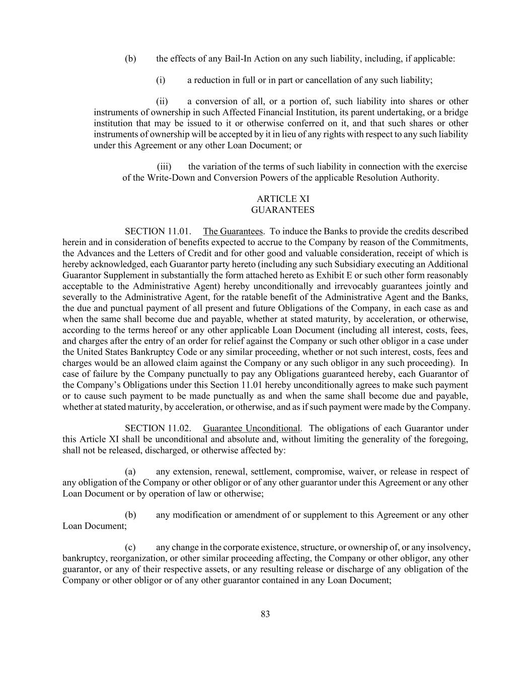 83 (b) the effects of any Bail-In Action on any such liability, including, if applicable: (i) a reduction in full or in part or cancellation of any such liability; (ii) a conversion of all, or a portion of, such liability into shares or other instruments of ownership in such Affected Financial Institution, its parent undertaking, or a bridge institution that may be issued to it or otherwise conferred on it, and that such shares or other instruments of ownership will be accepted by it in lieu of any rights with respect to any such liability under this Agreement or any other Loan Document; or (iii) the variation of the terms of such liability in connection with the exercise of the Write-Down and Conversion Powers of the applicable Resolution Authority. ARTICLE XI GUARANTEES SECTION 11.01. The Guarantees. To induce the Banks to provide the credits described herein and in consideration of benefits expected to accrue to the Company by reason of the Commitments, the Advances and the Letters of Credit and for other good and valuable consideration, receipt of which is hereby acknowledged, each Guarantor party hereto (including any such Subsidiary executing an Additional Guarantor Supplement in substantially the form attached hereto as Exhibit E or such other form reasonably acceptable to the Administrative Agent) hereby unconditionally and irrevocably guarantees jointly and severally to the Administrative Agent, for the ratable benefit of the Administrative Agent and the Banks, the due and punctual payment of all present and future Obligations of the Company, in each case as and when the same shall become due and payable, whether at stated maturity, by acceleration, or otherwise, according to the terms hereof or any other applicable Loan Document (including all interest, costs, fees, and charges after the entry of an order for relief against the Company or such other obligor in a case under the United States Bankruptcy Code or any similar proceeding, whether or not such interest, costs, fees and charges would be an allowed claim against the Company or any such obligor in any such proceeding). In case of failure by the Company punctually to pay any Obligations guaranteed hereby, each Guarantor of the Company’s Obligations under this Section 11.01 hereby unconditionally agrees to make such payment or to cause such payment to be made punctually as and when the same shall become due and payable, whether at stated maturity, by acceleration, or otherwise, and as if such payment were made by the Company. SECTION 11.02. Guarantee Unconditional. The obligations of each Guarantor under this Article XI shall be unconditional and absolute and, without limiting the generality of the foregoing, shall not be released, discharged, or otherwise affected by: (a) any extension, renewal, settlement, compromise, waiver, or release in respect of any obligation of the Company or other obligor or of any other guarantor under this Agreement or any other Loan Document or by operation of law or otherwise; (b) any modification or amendment of or supplement to this Agreement or any other Loan Document; (c) any change in the corporate existence, structure, or ownership of, or any insolvency, bankruptcy, reorganization, or other similar proceeding affecting, the Company or other obligor, any other guarantor, or any of their respective assets, or any resulting release or discharge of any obligation of the Company or other obligor or of any other guarantor contained in any Loan Document;
