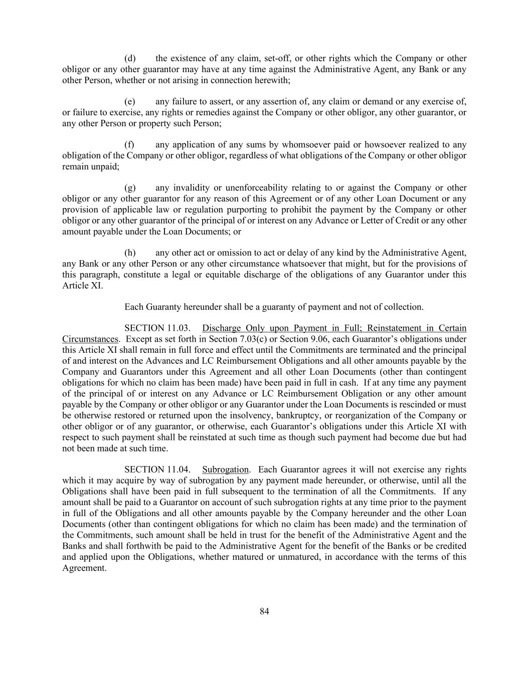 84 (d) the existence of any claim, set-off, or other rights which the Company or other obligor or any other guarantor may have at any time against the Administrative Agent, any Bank or any other Person, whether or not arising in connection herewith; (e) any failure to assert, or any assertion of, any claim or demand or any exercise of, or failure to exercise, any rights or remedies against the Company or other obligor, any other guarantor, or any other Person or property such Person; (f) any application of any sums by whomsoever paid or howsoever realized to any obligation of the Company or other obligor, regardless of what obligations of the Company or other obligor remain unpaid; (g) any invalidity or unenforceability relating to or against the Company or other obligor or any other guarantor for any reason of this Agreement or of any other Loan Document or any provision of applicable law or regulation purporting to prohibit the payment by the Company or other obligor or any other guarantor of the principal of or interest on any Advance or Letter of Credit or any other amount payable under the Loan Documents; or (h) any other act or omission to act or delay of any kind by the Administrative Agent, any Bank or any other Person or any other circumstance whatsoever that might, but for the provisions of this paragraph, constitute a legal or equitable discharge of the obligations of any Guarantor under this Article XI. Each Guaranty hereunder shall be a guaranty of payment and not of collection. SECTION 11.03. Discharge Only upon Payment in Full; Reinstatement in Certain Circumstances. Except as set forth in Section 7.03(c) or Section 9.06, each Guarantor’s obligations under this Article XI shall remain in full force and effect until the Commitments are terminated and the principal of and interest on the Advances and LC Reimbursement Obligations and all other amounts payable by the Company and Guarantors under this Agreement and all other Loan Documents (other than contingent obligations for which no claim has been made) have been paid in full in cash. If at any time any payment of the principal of or interest on any Advance or LC Reimbursement Obligation or any other amount payable by the Company or other obligor or any Guarantor under the Loan Documents is rescinded or must be otherwise restored or returned upon the insolvency, bankruptcy, or reorganization of the Company or other obligor or of any guarantor, or otherwise, each Guarantor’s obligations under this Article XI with respect to such payment shall be reinstated at such time as though such payment had become due but had not been made at such time. SECTION 11.04. Subrogation. Each Guarantor agrees it will not exercise any rights which it may acquire by way of subrogation by any payment made hereunder, or otherwise, until all the Obligations shall have been paid in full subsequent to the termination of all the Commitments. If any amount shall be paid to a Guarantor on account of such subrogation rights at any time prior to the payment in full of the Obligations and all other amounts payable by the Company hereunder and the other Loan Documents (other than contingent obligations for which no claim has been made) and the termination of the Commitments, such amount shall be held in trust for the benefit of the Administrative Agent and the Banks and shall forthwith be paid to the Administrative Agent for the benefit of the Banks or be credited and applied upon the Obligations, whether matured or unmatured, in accordance with the terms of this Agreement.