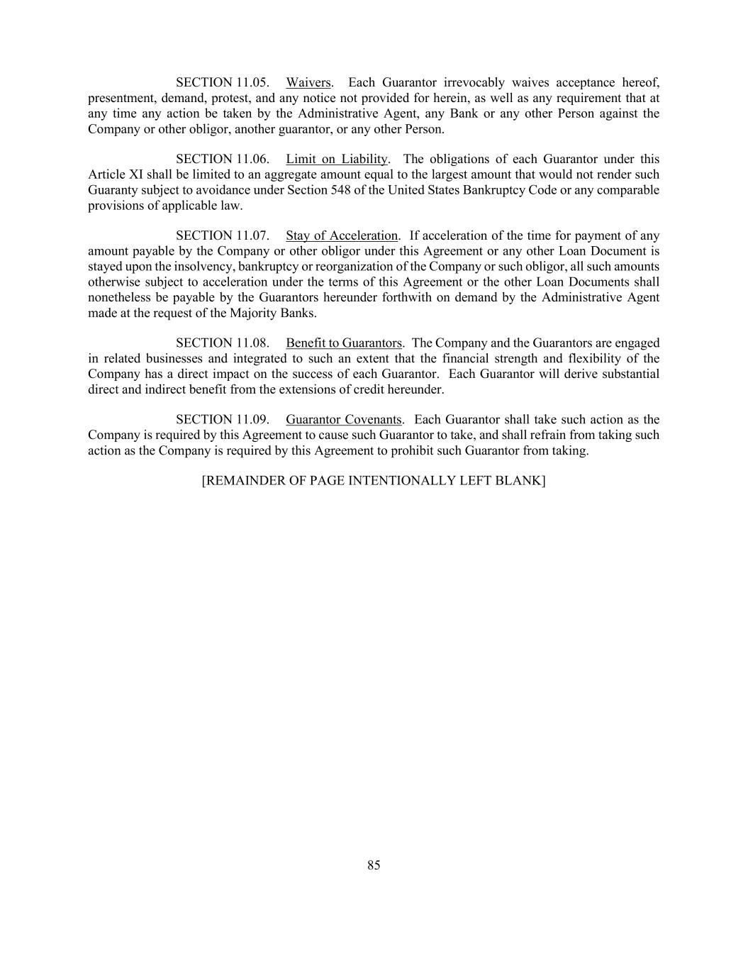 85 SECTION 11.05. Waivers. Each Guarantor irrevocably waives acceptance hereof, presentment, demand, protest, and any notice not provided for herein, as well as any requirement that at any time any action be taken by the Administrative Agent, any Bank or any other Person against the Company or other obligor, another guarantor, or any other Person. SECTION 11.06. Limit on Liability. The obligations of each Guarantor under this Article XI shall be limited to an aggregate amount equal to the largest amount that would not render such Guaranty subject to avoidance under Section 548 of the United States Bankruptcy Code or any comparable provisions of applicable law. SECTION 11.07. Stay of Acceleration. If acceleration of the time for payment of any amount payable by the Company or other obligor under this Agreement or any other Loan Document is stayed upon the insolvency, bankruptcy or reorganization of the Company or such obligor, all such amounts otherwise subject to acceleration under the terms of this Agreement or the other Loan Documents shall nonetheless be payable by the Guarantors hereunder forthwith on demand by the Administrative Agent made at the request of the Majority Banks. SECTION 11.08. Benefit to Guarantors. The Company and the Guarantors are engaged in related businesses and integrated to such an extent that the financial strength and flexibility of the Company has a direct impact on the success of each Guarantor. Each Guarantor will derive substantial direct and indirect benefit from the extensions of credit hereunder. SECTION 11.09. Guarantor Covenants. Each Guarantor shall take such action as the Company is required by this Agreement to cause such Guarantor to take, and shall refrain from taking such action as the Company is required by this Agreement to prohibit such Guarantor from taking. [REMAINDER OF PAGE INTENTIONALLY LEFT BLANK]