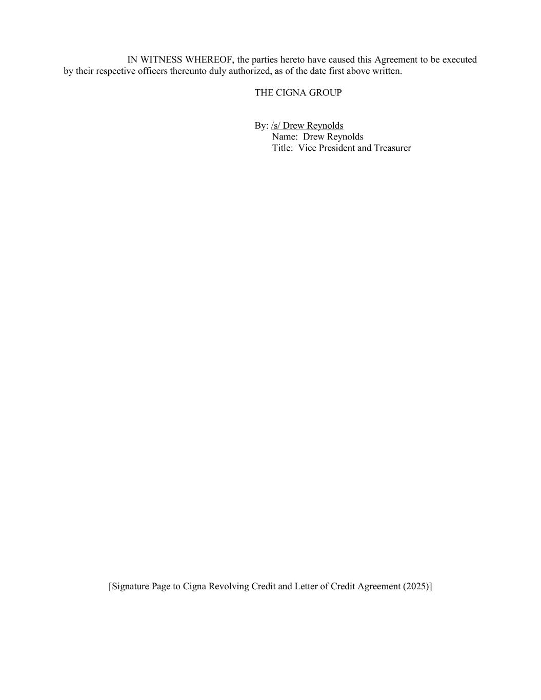 [Signature Page to Cigna Revolving Credit and Letter of Credit Agreement (2025)] IN WITNESS WHEREOF, the parties hereto have caused this Agreement to be executed by their respective officers thereunto duly authorized, as of the date first above written. THE CIGNA GROUP By: /s/ Drew Reynolds Name: Drew Reynolds Title: Vice President and Treasurer