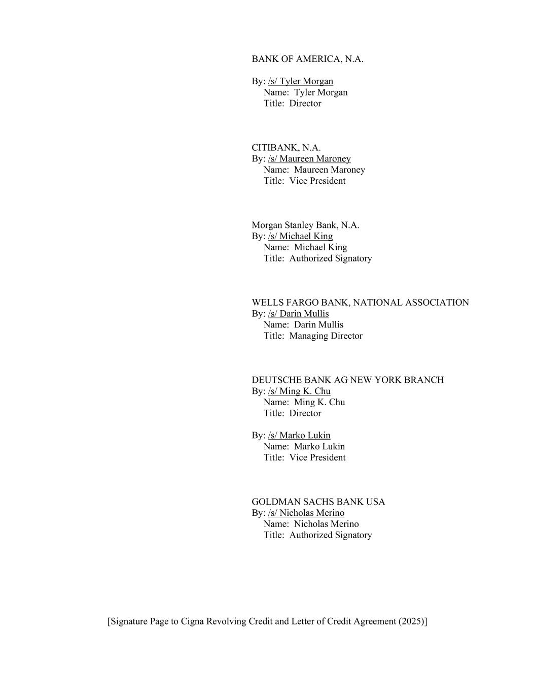 [Signature Page to Cigna Revolving Credit and Letter of Credit Agreement (2025)] BANK OF AMERICA, N.A. By: /s/ Tyler Morgan Name: Tyler Morgan Title: Director CITIBANK, N.A. By: /s/ Maureen Maroney Name: Maureen Maroney Title: Vice President Morgan Stanley Bank, N.A. By: /s/ Michael King Name: Michael King Title: Authorized Signatory WELLS FARGO BANK, NATIONAL ASSOCIATION By: /s/ Darin Mullis Name: Darin Mullis Title: Managing Director DEUTSCHE BANK AG NEW YORK BRANCH By: /s/ Ming K. Chu Name: Ming K. Chu Title: Director By: /s/ Marko Lukin Name: Marko Lukin Title: Vice President GOLDMAN SACHS BANK USA By: /s/ Nicholas Merino Name: Nicholas Merino Title: Authorized Signatory