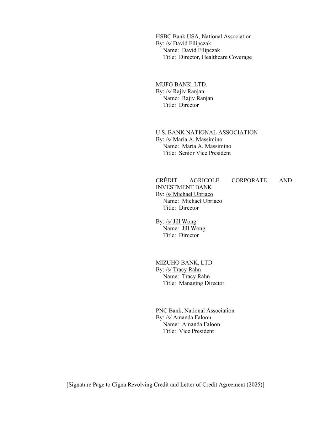 [Signature Page to Cigna Revolving Credit and Letter of Credit Agreement (2025)] HSBC Bank USA, National Association By: /s/ David Filipczak Name: David Filipczak Title: Director, Healthcare Coverage MUFG BANK, LTD. By: /s/ Rajiv Ranjan Name: Rajiv Ranjan Title: Director U.S. BANK NATIONAL ASSOCIATION By: /s/ Maria A. Massimino Name: Maria A. Massimino Title: Senior Vice President CRÉDIT AGRICOLE CORPORATE AND INVESTMENT BANK By: /s/ Michael Ubriaco Name: Michael Ubriaco Title: Director By: /s/ Jill Wong Name: Jill Wong Title: Director MIZUHO BANK, LTD. By: /s/ Tracy Rahn Name: Tracy Rahn Title: Managing Director PNC Bank, National Association By: /s/ Amanda Faloon Name: Amanda Faloon Title: Vice President