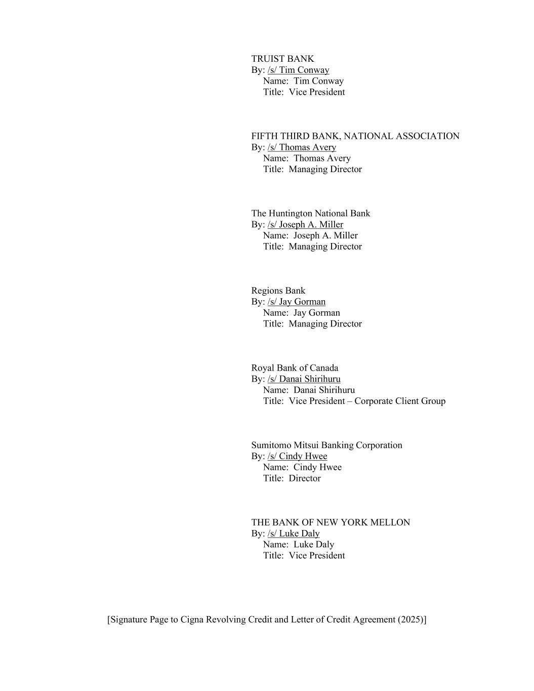 [Signature Page to Cigna Revolving Credit and Letter of Credit Agreement (2025)] TRUIST BANK By: /s/ Tim Conway Name: Tim Conway Title: Vice President FIFTH THIRD BANK, NATIONAL ASSOCIATION By: /s/ Thomas Avery Name: Thomas Avery Title: Managing Director The Huntington National Bank By: /s/ Joseph A. Miller Name: Joseph A. Miller Title: Managing Director Regions Bank By: /s/ Jay Gorman Name: Jay Gorman Title: Managing Director Royal Bank of Canada By: /s/ Danai Shirihuru Name: Danai Shirihuru Title: Vice President – Corporate Client Group Sumitomo Mitsui Banking Corporation By: /s/ Cindy Hwee Name: Cindy Hwee Title: Director THE BANK OF NEW YORK MELLON By: /s/ Luke Daly Name: Luke Daly Title: Vice President