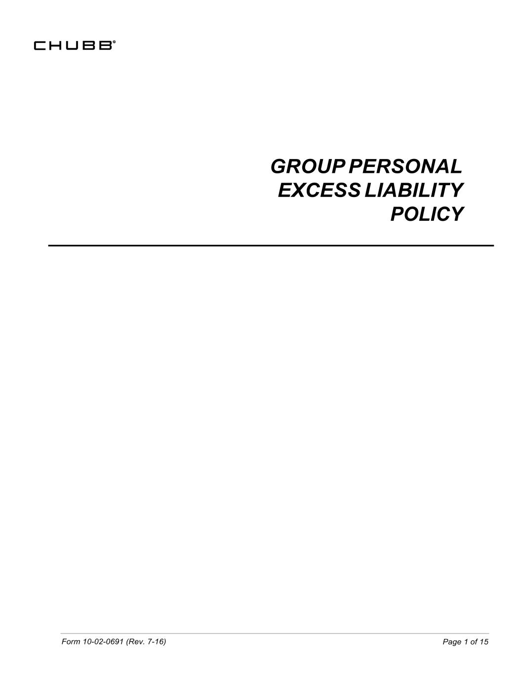 Form 10-02-0691 (Rev. 7-16) Page 1 of 15 GROUP PERSONAL EXCESS LIABILITY POLICY