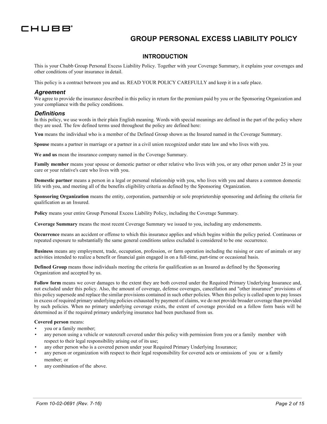 Form 10-02-0691 (Rev. 7-16) Page 2 of 15 GROUP PERSONAL EXCESS LIABILITY POLICY INTRODUCTION This is your Chubb Group Personal Excess Liability Policy. Together with your Coverage Summary, it explains your coverages and other conditions of your insurance in detail. This policy is a contract between you and us. READ YOUR POLICY CAREFULLY and keep it in a safe place. Agreement We agree to provide the insurance described in this policy in return for the premium paid by you or the Sponsoring Organization and your compliance with the policy conditions. Definitions In this policy, we use words in their plain English meaning. Words with special meanings are defined in the part of the policy where they are used. The few defined terms used throughout the policy are defined here: You means the individual who is a member of the Defined Group shown as the Insured named in the Coverage Summary. Spouse means a partner in marriage or a partner in a civil union recognized under state law and who lives with you. We and us mean the insurance company named in the Coverage Summary. Family member means your spouse or domestic partner or other relative who lives with you, or any other person under 25 in your care or your relative's care who lives with you. Domestic partner means a person in a legal or personal relationship with you, who lives with you and shares a common domestic life with you, and meeting all of the benefits eligibility criteria as defined by the Sponsoring Organization. Sponsoring Organization means the entity, corporation, partnership or sole proprietorship sponsoring and defining the criteria for qualification as an Insured. Policy means your entire Group Personal Excess Liability Policy, including the Coverage Summary. Coverage Summary means the most recent Coverage Summary we issued to you, including any endorsements. Occurrence means an accident or offense to which this insurance applies and which begins within the policy period. Continuous or repeated exposure to substantially the same general conditions unless excluded is considered to be one occurrence. Business means any employment, trade, occupation, profession, or farm operation including the raising or care of animals or any activities intended to realize a benefit or financial gain engaged in on a full-time, part-time or occasional basis. Defined Group means those individuals meeting the criteria for qualification as an Insured as defined by the Sponsoring Organization and accepted by us. Follow form means we cover damages to the extent they are both covered under the Required Primary Underlying Insurance and, not excluded under this policy. Also, the amount of coverage, defense coverages, cancellation and "other insurance" provisions of this policy supersede and replace the similar provisions contained in such other policies. When this policy is called upon to pay losses in excess of required primary underlying policies exhausted by payment of claims, we do not provide broader coverage than provided by such policies. When no primary underlying coverage exists, the extent of coverage provided on a follow form basis will be determined as if the required primary underlying insurance had been purchased from us. Covered person means: • you or a family member; • any person using a vehicle or watercraft covered under this policy with permission from you or a family member with respect to their legal responsibility arising out of its use; • any other person who is a covered person under your Required Primary Underlying Insurance; • any person or organization with respect to their legal responsibility for covered acts or omissions of you or a family member; or • any combination of the above.