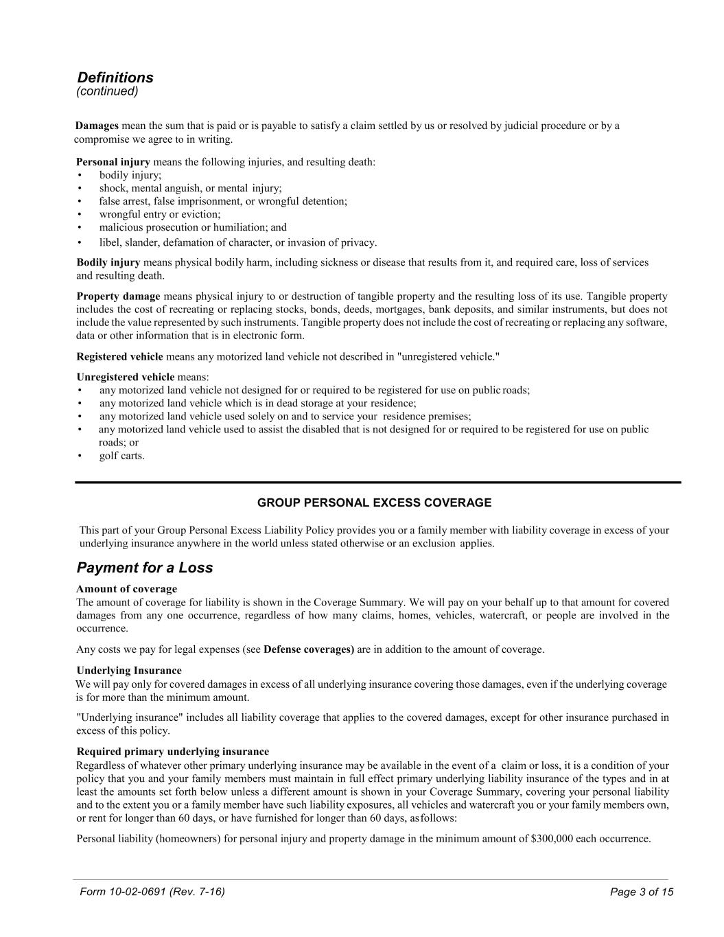 Form 10-02-0691 (Rev. 7-16) Page 3 of 15 Definitions (continued) Damages mean the sum that is paid or is payable to satisfy a claim settled by us or resolved by judicial procedure or by a compromise we agree to in writing. Personal injury means the following injuries, and resulting death: • bodily injury; • shock, mental anguish, or mental injury; • false arrest, false imprisonment, or wrongful detention; • wrongful entry or eviction; • malicious prosecution or humiliation; and • libel, slander, defamation of character, or invasion of privacy. Bodily injury means physical bodily harm, including sickness or disease that results from it, and required care, loss of services and resulting death. Property damage means physical injury to or destruction of tangible property and the resulting loss of its use. Tangible property includes the cost of recreating or replacing stocks, bonds, deeds, mortgages, bank deposits, and similar instruments, but does not include the value represented by such instruments. Tangible property does not include the cost of recreating or replacing any software, data or other information that is in electronic form. Registered vehicle means any motorized land vehicle not described in "unregistered vehicle." Unregistered vehicle means: • any motorized land vehicle not designed for or required to be registered for use on public roads; • any motorized land vehicle which is in dead storage at your residence; • any motorized land vehicle used solely on and to service your residence premises; • any motorized land vehicle used to assist the disabled that is not designed for or required to be registered for use on public roads; or • golf carts. GROUP PERSONAL EXCESS COVERAGE This part of your Group Personal Excess Liability Policy provides you or a family member with liability coverage in excess of your underlying insurance anywhere in the world unless stated otherwise or an exclusion applies. Payment for a Loss Amount of coverage The amount of coverage for liability is shown in the Coverage Summary. We will pay on your behalf up to that amount for covered damages from any one occurrence, regardless of how many claims, homes, vehicles, watercraft, or people are involved in the occurrence. Any costs we pay for legal expenses (see Defense coverages) are in addition to the amount of coverage. Underlying Insurance We will pay only for covered damages in excess of all underlying insurance covering those damages, even if the underlying coverage is for more than the minimum amount. "Underlying insurance" includes all liability coverage that applies to the covered damages, except for other insurance purchased in excess of this policy. Required primary underlying insurance Regardless of whatever other primary underlying insurance may be available in the event of a claim or loss, it is a condition of your policy that you and your family members must maintain in full effect primary underlying liability insurance of the types and in at least the amounts set forth below unless a different amount is shown in your Coverage Summary, covering your personal liability and to the extent you or a family member have such liability exposures, all vehicles and watercraft you or your family members own, or rent for longer than 60 days, or have furnished for longer than 60 days, as follows: Personal liability (homeowners) for personal injury and property damage in the minimum amount of $300,000 each occurrence.