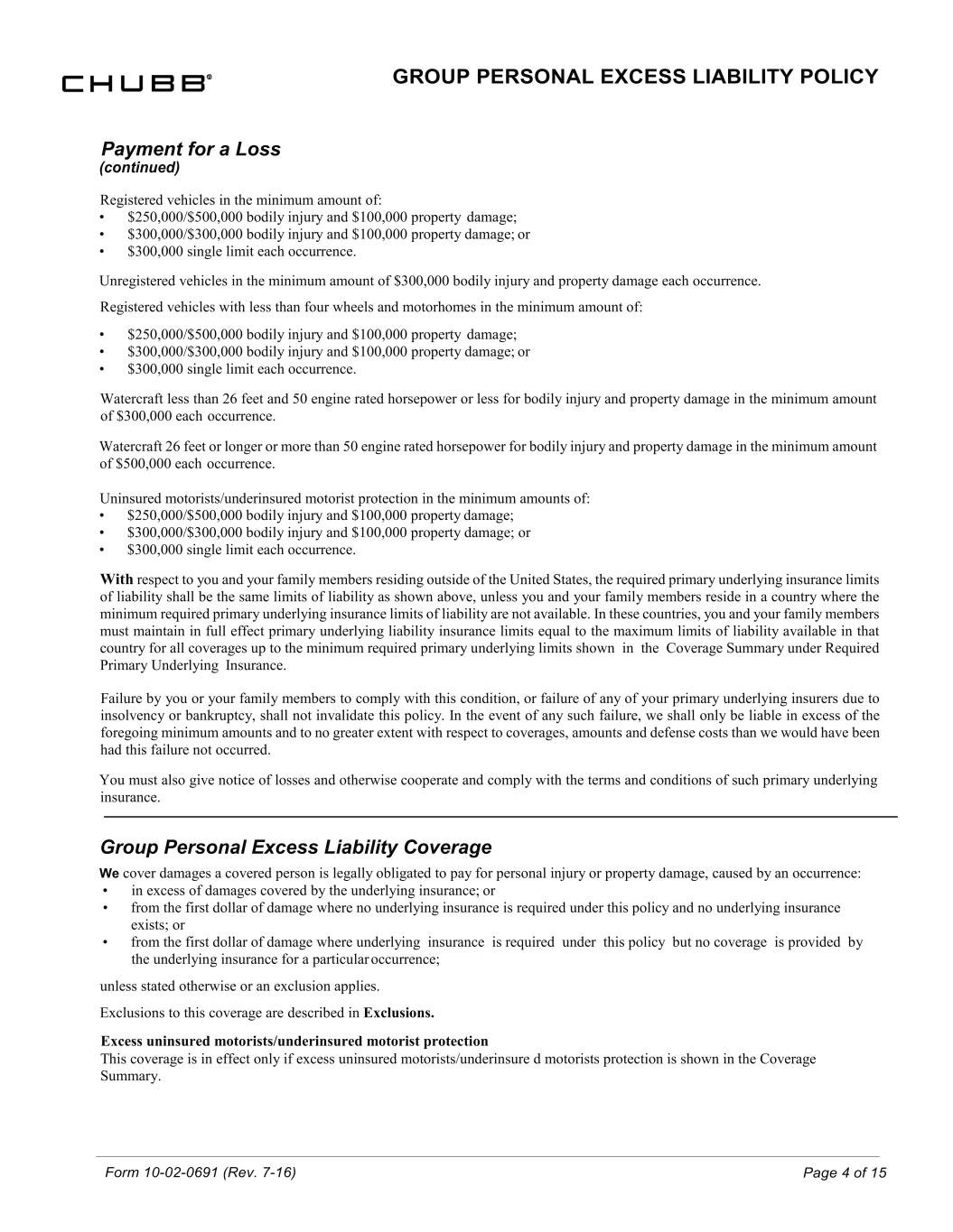 Form 10-02-0691 (Rev. 7-16) Page 4 of 15 GROUP PERSONAL EXCESS LIABILITY POLICY Payment for a Loss (continued) Registered vehicles in the minimum amount of: • $250,000/$500,000 bodily injury and $100,000 property damage; • $300,000/$300,000 bodily injury and $100,000 property damage; or • $300,000 single limit each occurrence. Unregistered vehicles in the minimum amount of $300,000 bodily injury and property damage each occurrence. Registered vehicles with less than four wheels and motorhomes in the minimum amount of: • $250,000/$500,000 bodily injury and $100,000 property damage; • $300,000/$300,000 bodily injury and $100,000 property damage; or • $300,000 single limit each occurrence. Watercraft less than 26 feet and 50 engine rated horsepower or less for bodily injury and property damage in the minimum amount of $300,000 each occurrence. Watercraft 26 feet or longer or more than 50 engine rated horsepower for bodily injury and property damage in the minimum amount of $500,000 each occurrence. Uninsured motorists/underinsured motorist protection in the minimum amounts of: • $250,000/$500,000 bodily injury and $100,000 property damage; • $300,000/$300,000 bodily injury and $100,000 property damage; or • $300,000 single limit each occurrence. With respect to you and your family members residing outside of the United States, the required primary underlying insurance limits of liability shall be the same limits of liability as shown above, unless you and your family members reside in a country where the minimum required primary underlying insurance limits of liability are not available. In these countries, you and your family members must maintain in full effect primary underlying liability insurance limits equal to the maximum limits of liability available in that country for all coverages up to the minimum required primary underlying limits shown in the Coverage Summary under Required Primary Underlying Insurance. Failure by you or your family members to comply with this condition, or failure of any of your primary underlying insurers due to insolvency or bankruptcy, shall not invalidate this policy. In the event of any such failure, we shall only be liable in excess of the foregoing minimum amounts and to no greater extent with respect to coverages, amounts and defense costs than we would have been had this failure not occurred. You must also give notice of losses and otherwise cooperate and comply with the terms and conditions of such primary underlying insurance. Group Personal Excess Liability Coverage We cover damages a covered person is legally obligated to pay for personal injury or property damage, caused by an occurrence: • in excess of damages covered by the underlying insurance; or • from the first dollar of damage where no underlying insurance is required under this policy and no underlying insurance exists; or • from the first dollar of damage where underlying insurance is required under this policy but no coverage is provided by the underlying insurance for a particular occurrence; unless stated otherwise or an exclusion applies. Exclusions to this coverage are described in Exclusions. Excess uninsured motorists/underinsured motorist protection This coverage is in effect only if excess uninsured motorists/underinsure d motorists protection is shown in the Coverage Summary.