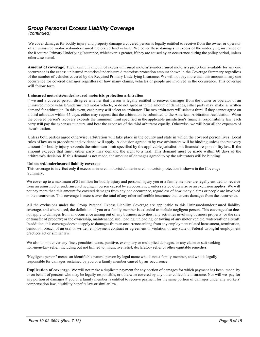 Form 10-02-0691 (Rev. 7-16) Page 5 of 15 Group Personal Excess Liability Coverage (continued) We cover damages for bodily injury and property damage a covered person is legally entitled to receive from the owner or operator of an uninsured motorized/underinsured motorized land vehicle. We cover these damages in excess of the underlying insurance or the Required Primary Underlying Insurance, whichever is greater, if they are caused by an occurrence during the policy period, unless otherwise stated. Amount of coverage. The maximum amount of excess uninsured motorists/underinsured motorists protection available for any one occurrence is the excess uninsured motorists/underinsure d motorists protection amount shown in the Coverage Summary regardless of the number of vehicles covered by the Required Primary Underlying Insurance. We will not pay more than this amount in any one occurrence for covered damages regardless of how many claims, vehicles or people are involved in the occurrence. This coverage will follow form. Uninsured motorists/underinsured motorists protection arbitration If we and a covered person disagree whether that person is legally entitled to recover damages from the owner or operator of an uninsured motor vehicle/underinsured motor vehicle, or do not agree as to the amount of damages, either party may make a written demand for arbitration. In this event, each party will select an arbitrator. The two arbitrators will select a third. If they cannot agree on a third arbitrator within 45 days, either may request that the arbitration be submitted to the American Arbitration Association. When the covered person's recovery exceeds the minimum limit specified in the applicable jurisdiction's financial responsibility law, each party will pay the expenses it incurs, and bear the expenses of the third arbitrator equally. Otherwise, we will bear all the expenses of the arbitration. Unless both parties agree otherwise, arbitration will take place in the county and state in which the covered person lives. Local rules of law as to procedure and evidence will apply. A decision agreed to by two arbitrators will be binding unless the recovery amount for bodily injury exceeds the minimum limit specified by the applicable jurisdiction's financial responsibility law. If the amount exceeds that limit, either party may demand the right to a trial. This demand must be made within 60 days of the arbitrator's decision. If this demand is not made, the amount of damages agreed to by the arbitrators will be binding. Uninsured/underinsured liability coverage This coverage is in effect only if excess uninsured motorists/underinsured motorists protection is shown in the Coverage Summary. We cover up to a maximum of $1 million for bodily injury and personal injury you or a family member are legally entitled to receive from an uninsured or underinsured negligent person caused by an occurrence, unless stated otherwise or an exclusion applies. We will not pay more than this amount for covered damages from any one occurrence, regardless of how many claims or people are involved in the occurrence. This coverage is excess over the total of any other collectible insurance that covers damages from the occurrence. All the exclusions under the Group Personal Excess Liability Coverage are applicable to this Uninsured/underinsured liability coverage, and where used, the definition of you or a family member is extended to include negligent person. This coverage also does not apply to damages from an occurrence arising out of any business activities; any activities involving business property or the sale or transfer of property; or the ownership, maintenance, use, loading, unloading, or towing of any motor vehicle, watercraft or aircraft. In addition, this coverage does not apply to damages from an occurrence arising from any employment related harassment, termination, demotion, breach of an oral or written employment contract or agreement or violation of any state or federal wrongful employment practices act or similar law. We also do not cover any fines, penalties, taxes, punitive, exemplary or multiplied damages, or any claim or suit seeking non-monetary relief, including but not limited to, injunctive relief, declaratory relief or other equitable remedies. ''Negligent person" means an identifiable natural person by legal name who is not a family member, and who is legally responsible for damages sustained by you or a family member caused by an occurrence. Duplication of coverage. We will not make a duplicate payment for any portion of damages for which payment has been made by or on behalf of persons who may be legally responsible, or otherwise covered by any other collectible insurance. Nor will we pay for any portion of damages if you or a family member is entitled to receive payment for the same portion of damages under any workers' compensation law, disability benefits law or similar law.