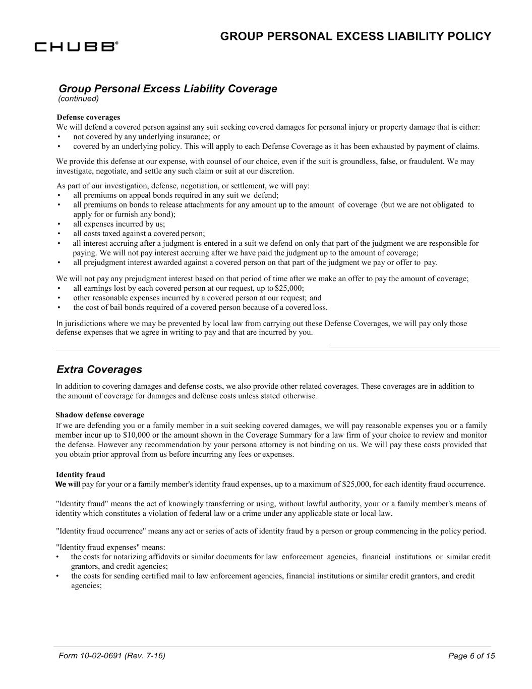 Form 10-02-0691 (Rev. 7-16) Page 6 of 15 GROUP PERSONAL EXCESS LIABILITY POLICY Group Personal Excess Liability Coverage (continued) Defense coverages We will defend a covered person against any suit seeking covered damages for personal injury or property damage that is either: • not covered by any underlying insurance; or • covered by an underlying policy. This will apply to each Defense Coverage as it has been exhausted by payment of claims. We provide this defense at our expense, with counsel of our choice, even if the suit is groundless, false, or fraudulent. We may investigate, negotiate, and settle any such claim or suit at our discretion. As part of our investigation, defense, negotiation, or settlement, we will pay: • all premiums on appeal bonds required in any suit we defend; • all premiums on bonds to release attachments for any amount up to the amount of coverage (but we are not obligated to apply for or furnish any bond); • all expenses incurred by us; • all costs taxed against a covered person; • all interest accruing after a judgment is entered in a suit we defend on only that part of the judgment we are responsible for paying. We will not pay interest accruing after we have paid the judgment up to the amount of coverage; • all prejudgment interest awarded against a covered person on that part of the judgment we pay or offer to pay. We will not pay any prejudgment interest based on that period of time after we make an offer to pay the amount of coverage; • all earnings lost by each covered person at our request, up to $25,000; • other reasonable expenses incurred by a covered person at our request; and • the cost of bail bonds required of a covered person because of a covered loss. In jurisdictions where we may be prevented by local law from carrying out these Defense Coverages, we will pay only those defense expenses that we agree in writing to pay and that are incurred by you. Extra Coverages In addition to covering damages and defense costs, we also provide other related coverages. These coverages are in addition to the amount of coverage for damages and defense costs unless stated otherwise. Shadow defense coverage If we are defending you or a family member in a suit seeking covered damages, we will pay reasonable expenses you or a family member incur up to $10,000 or the amount shown in the Coverage Summary for a law firm of your choice to review and monitor the defense. However any recommendation by your persona attorney is not binding on us. We will pay these costs provided that you obtain prior approval from us before incurring any fees or expenses. Identity fraud We will pay for your or a family member's identity fraud expenses, up to a maximum of $25,000, for each identity fraud occurrence. "Identity fraud" means the act of knowingly transferring or using, without lawful authority, your or a family member's means of identity which constitutes a violation of federal law or a crime under any applicable state or local law. "Identity fraud occurrence" means any act or series of acts of identity fraud by a person or group commencing in the policy period. "Identity fraud expenses" means: • the costs for notarizing affidavits or similar documents for law enforcement agencies, financial institutions or similar credit grantors, and credit agencies; • the costs for sending certified mail to law enforcement agencies, financial institutions or similar credit grantors, and credit agencies;