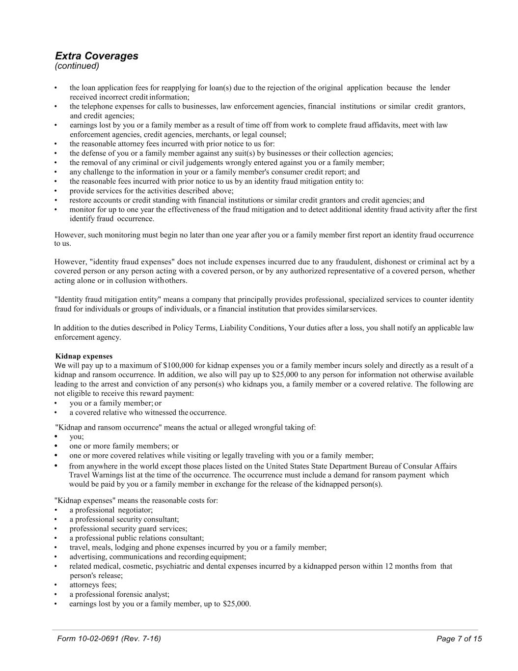 Form 10-02-0691 (Rev. 7-16) Page 7 of 15 Extra Coverages (continued) • the loan application fees for reapplying for loan(s) due to the rejection of the original application because the lender received incorrect credit information; • the telephone expenses for calls to businesses, law enforcement agencies, financial institutions or similar credit grantors, and credit agencies; • earnings lost by you or a family member as a result of time off from work to complete fraud affidavits, meet with law enforcement agencies, credit agencies, merchants, or legal counsel; • the reasonable attorney fees incurred with prior notice to us for: • the defense of you or a family member against any suit(s) by businesses or their collection agencies; • the removal of any criminal or civil judgements wrongly entered against you or a family member; • any challenge to the information in your or a family member's consumer credit report; and • the reasonable fees incurred with prior notice to us by an identity fraud mitigation entity to: • provide services for the activities described above; • restore accounts or credit standing with financial institutions or similar credit grantors and credit agencies; and • monitor for up to one year the effectiveness of the fraud mitigation and to detect additional identity fraud activity after the first identify fraud occurrence. However, such monitoring must begin no later than one year after you or a family member first report an identity fraud occurrence to us. However, "identity fraud expenses" does not include expenses incurred due to any fraudulent, dishonest or criminal act by a covered person or any person acting with a covered person, or by any authorized representative of a covered person, whether acting alone or in collusion with others. "Identity fraud mitigation entity" means a company that principally provides professional, specialized services to counter identity fraud for individuals or groups of individuals, or a financial institution that provides similar services. In addition to the duties described in Policy Terms, Liability Conditions, Your duties after a loss, you shall notify an applicable law enforcement agency. Kidnap expenses We will pay up to a maximum of $100,000 for kidnap expenses you or a family member incurs solely and directly as a result of a kidnap and ransom occurrence. In addition, we also will pay up to $25,000 to any person for information not otherwise available leading to the arrest and conviction of any person(s) who kidnaps you, a family member or a covered relative. The following are not eligible to receive this reward payment: • you or a family member; or • a covered relative who witnessed the occurrence. "Kidnap and ransom occurrence" means the actual or alleged wrongful taking of: • you; • one or more family members; or • one or more covered relatives while visiting or legally traveling with you or a family member; • from anywhere in the world except those places listed on the United States State Department Bureau of Consular Affairs Travel Warnings list at the time of the occurrence. The occurrence must include a demand for ransom payment which would be paid by you or a family member in exchange for the release of the kidnapped person(s). "Kidnap expenses" means the reasonable costs for: • a professional negotiator; • a professional security consultant; • professional security guard services; • a professional public relations consultant; • travel, meals, lodging and phone expenses incurred by you or a family member; • advertising, communications and recording equipment; • related medical, cosmetic, psychiatric and dental expenses incurred by a kidnapped person within 12 months from that person's release; • attorneys fees; • a professional forensic analyst; • earnings lost by you or a family member, up to $25,000.
