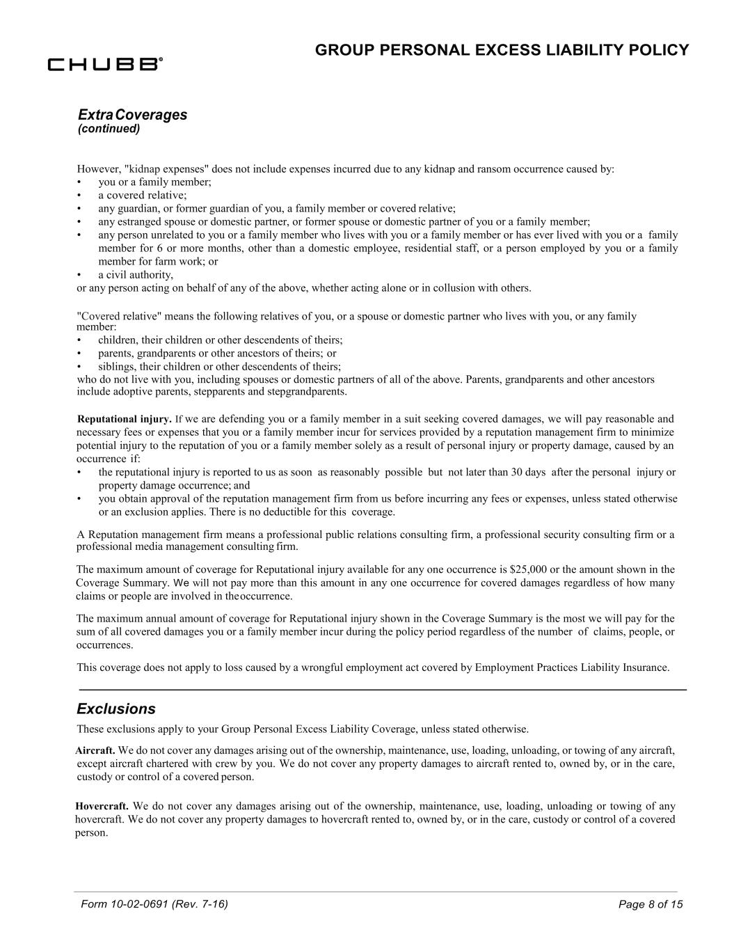 Form 10-02-0691 (Rev. 7-16) Page 8 of 15 Extra Coverages (continued) GROUP PERSONAL EXCESS LIABILITY POLICY However, "kidnap expenses" does not include expenses incurred due to any kidnap and ransom occurrence caused by: • you or a family member; • a covered relative; • any guardian, or former guardian of you, a family member or covered relative; • any estranged spouse or domestic partner, or former spouse or domestic partner of you or a family member; • any person unrelated to you or a family member who lives with you or a family member or has ever lived with you or a family member for 6 or more months, other than a domestic employee, residential staff, or a person employed by you or a family member for farm work; or • a civil authority, or any person acting on behalf of any of the above, whether acting alone or in collusion with others. "Covered relative" means the following relatives of you, or a spouse or domestic partner who lives with you, or any family member: • children, their children or other descendents of theirs; • parents, grandparents or other ancestors of theirs; or • siblings, their children or other descendents of theirs; who do not live with you, including spouses or domestic partners of all of the above. Parents, grandparents and other ancestors include adoptive parents, stepparents and stepgrandparents. Reputational injury. If we are defending you or a family member in a suit seeking covered damages, we will pay reasonable and necessary fees or expenses that you or a family member incur for services provided by a reputation management firm to minimize potential injury to the reputation of you or a family member solely as a result of personal injury or property damage, caused by an occurrence if: • the reputational injury is reported to us as soon as reasonably possible but not later than 30 days after the personal injury or property damage occurrence; and • you obtain approval of the reputation management firm from us before incurring any fees or expenses, unless stated otherwise or an exclusion applies. There is no deductible for this coverage. A Reputation management firm means a professional public relations consulting firm, a professional security consulting firm or a professional media management consulting firm. The maximum amount of coverage for Reputational injury available for any one occurrence is $25,000 or the amount shown in the Coverage Summary. We will not pay more than this amount in any one occurrence for covered damages regardless of how many claims or people are involved in the occurrence. The maximum annual amount of coverage for Reputational injury shown in the Coverage Summary is the most we will pay for the sum of all covered damages you or a family member incur during the policy period regardless of the number of claims, people, or occurrences. This coverage does not apply to loss caused by a wrongful employment act covered by Employment Practices Liability Insurance. Exclusions These exclusions apply to your Group Personal Excess Liability Coverage, unless stated otherwise. Aircraft. We do not cover any damages arising out of the ownership, maintenance, use, loading, unloading, or towing of any aircraft, except aircraft chartered with crew by you. We do not cover any property damages to aircraft rented to, owned by, or in the care, custody or control of a covered person. Hovercraft. We do not cover any damages arising out of the ownership, maintenance, use, loading, unloading or towing of any hovercraft. We do not cover any property damages to hovercraft rented to, owned by, or in the care, custody or control of a covered person.
