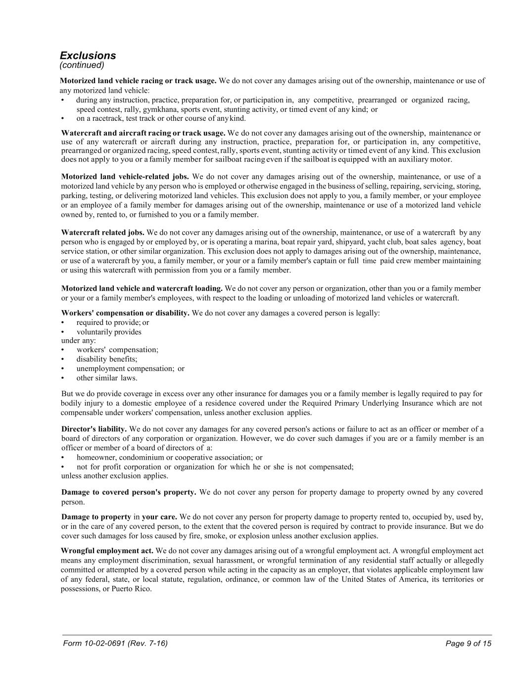 Form 10-02-0691 (Rev. 7-16) Page 9 of 15 Exclusions (continued) Motorized land vehicle racing or track usage. We do not cover any damages arising out of the ownership, maintenance or use of any motorized land vehicle: • during any instruction, practice, preparation for, or participation in, any competitive, prearranged or organized racing, speed contest, rally, gymkhana, sports event, stunting activity, or timed event of any kind; or • on a racetrack, test track or other course of any kind. Watercraft and aircraft racing or track usage. We do not cover any damages arising out of the ownership, maintenance or use of any watercraft or aircraft during any instruction, practice, preparation for, or participation in, any competitive, prearranged or organized racing, speed contest, rally, sports event, stunting activity or timed event of any kind. This exclusion does not apply to you or a family member for sailboat racing even if the sailboat is equipped with an auxiliary motor. Motorized land vehicle-related jobs. We do not cover any damages arising out of the ownership, maintenance, or use of a motorized land vehicle by any person who is employed or otherwise engaged in the business of selling, repairing, servicing, storing, parking, testing, or delivering motorized land vehicles. This exclusion does not apply to you, a family member, or your employee or an employee of a family member for damages arising out of the ownership, maintenance or use of a motorized land vehicle owned by, rented to, or furnished to you or a family member. Watercraft related jobs. We do not cover any damages arising out of the ownership, maintenance, or use of a watercraft by any person who is engaged by or employed by, or is operating a marina, boat repair yard, shipyard, yacht club, boat sales agency, boat service station, or other similar organization. This exclusion does not apply to damages arising out of the ownership, maintenance, or use of a watercraft by you, a family member, or your or a family member's captain or full time paid crew member maintaining or using this watercraft with permission from you or a family member. Motorized land vehicle and watercraft loading. We do not cover any person or organization, other than you or a family member or your or a family member's employees, with respect to the loading or unloading of motorized land vehicles or watercraft. Workers' compensation or disability. We do not cover any damages a covered person is legally: • required to provide; or • voluntarily provides under any: • workers' compensation; • disability benefits; • unemployment compensation; or • other similar laws. But we do provide coverage in excess over any other insurance for damages you or a family member is legally required to pay for bodily injury to a domestic employee of a residence covered under the Required Primary Underlying Insurance which are not compensable under workers' compensation, unless another exclusion applies. Director's liability. We do not cover any damages for any covered person's actions or failure to act as an officer or member of a board of directors of any corporation or organization. However, we do cover such damages if you are or a family member is an officer or member of a board of directors of a: • homeowner, condominium or cooperative association; or • not for profit corporation or organization for which he or she is not compensated; unless another exclusion applies. Damage to covered person's property. We do not cover any person for property damage to property owned by any covered person. Damage to property in your care. We do not cover any person for property damage to property rented to, occupied by, used by, or in the care of any covered person, to the extent that the covered person is required by contract to provide insurance. But we do cover such damages for loss caused by fire, smoke, or explosion unless another exclusion applies. Wrongful employment act. We do not cover any damages arising out of a wrongful employment act. A wrongful employment act means any employment discrimination, sexual harassment, or wrongful termination of any residential staff actually or allegedly committed or attempted by a covered person while acting in the capacity as an employer, that violates applicable employment law of any federal, state, or local statute, regulation, ordinance, or common law of the United States of America, its territories or possessions, or Puerto Rico.