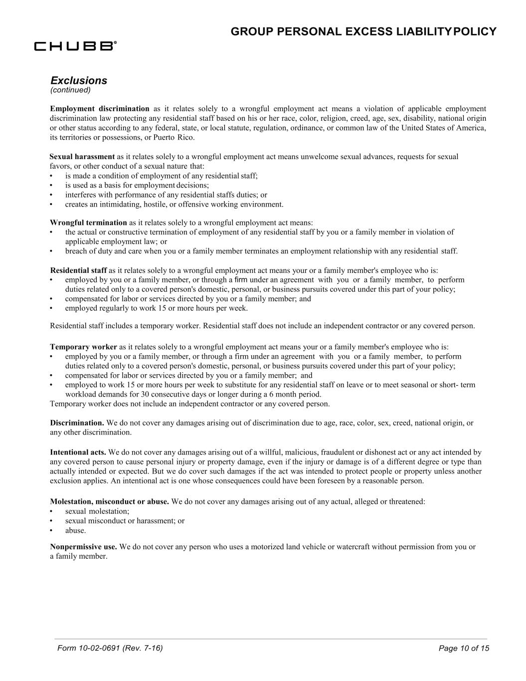Form 10-02-0691 (Rev. 7-16) Page 10 of 15 GROUP PERSONAL EXCESS LIABILITY POLICY Exclusions (continued) Employment discrimination as it relates solely to a wrongful employment act means a violation of applicable employment discrimination law protecting any residential staff based on his or her race, color, religion, creed, age, sex, disability, national origin or other status according to any federal, state, or local statute, regulation, ordinance, or common law of the United States of America, its territories or possessions, or Puerto Rico. Sexual harassment as it relates solely to a wrongful employment act means unwelcome sexual advances, requests for sexual favors, or other conduct of a sexual nature that: • is made a condition of employment of any residential staff; • is used as a basis for employment decisions; • interferes with performance of any residential staffs duties; or • creates an intimidating, hostile, or offensive working environment. Wrongful termination as it relates solely to a wrongful employment act means: • the actual or constructive termination of employment of any residential staff by you or a family member in violation of applicable employment law; or • breach of duty and care when you or a family member terminates an employment relationship with any residential staff. Residential staff as it relates solely to a wrongful employment act means your or a family member's employee who is: • employed by you or a family member, or through a firm under an agreement with you or a family member, to perform duties related only to a covered person's domestic, personal, or business pursuits covered under this part of your policy; • compensated for labor or services directed by you or a family member; and • employed regularly to work 15 or more hours per week. Residential staff includes a temporary worker. Residential staff does not include an independent contractor or any covered person. Temporary worker as it relates solely to a wrongful employment act means your or a family member's employee who is: • employed by you or a family member, or through a firm under an agreement with you or a family member, to perform duties related only to a covered person's domestic, personal, or business pursuits covered under this part of your policy; • compensated for labor or services directed by you or a family member; and • employed to work 15 or more hours per week to substitute for any residential staff on leave or to meet seasonal or short- term workload demands for 30 consecutive days or longer during a 6 month period. Temporary worker does not include an independent contractor or any covered person. Discrimination. We do not cover any damages arising out of discrimination due to age, race, color, sex, creed, national origin, or any other discrimination. Intentional acts. We do not cover any damages arising out of a willful, malicious, fraudulent or dishonest act or any act intended by any covered person to cause personal injury or property damage, even if the injury or damage is of a different degree or type than actually intended or expected. But we do cover such damages if the act was intended to protect people or property unless another exclusion applies. An intentional act is one whose consequences could have been foreseen by a reasonable person. Molestation, misconduct or abuse. We do not cover any damages arising out of any actual, alleged or threatened: • sexual molestation; • sexual misconduct or harassment; or • abuse. Nonpermissive use. We do not cover any person who uses a motorized land vehicle or watercraft without permission from you or a family member.