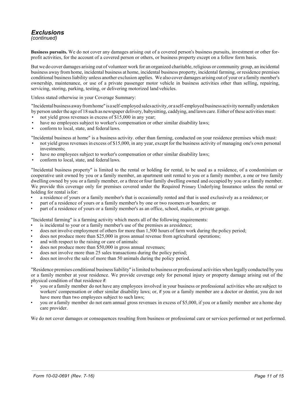 Form 10-02-0691 (Rev. 7-16) Page 11 of 15 Exclusions (continued) Business pursuits. We do not cover any damages arising out of a covered person's business pursuits, investment or other for- profit activities, for the account of a covered person or others, or business property except on a follow form basis. But we do cover damages arising out of volunteer work for an organized charitable, religious or community group, an incidental business away from home, incidental business at home, incidental business property, incidental farming, or residence premises conditional business liability unless another exclusion applies. We also cover damages arising out of your or a family member's ownership, maintenance, or use of a private passenger motor vehicle in business activities other than selling, repairing, servicing, storing, parking, testing, or delivering motorized land vehicles. Unless stated otherwise in your Coverage Summary: "Incidental business away from home" is a self-employed sales activity, or a self-employed business activity normally undertaken by person under the age of 18 such as newspaper delivery, babysitting, caddying, and lawn care. Either of these activities must: • not yield gross revenues in excess of $15,000 in any year; • have no employees subject to worker's compensation or other similar disability laws; • conform to local, state, and federal laws. "Incidental business at home" is a business activity. other than farming, conducted on your residence premises which must: • not yield gross revenues in excess of $15,000, in any year, except for the business activity of managing one's own personal investments; • have no employees subject to worker's compensation or other similar disability laws; • conform to local, state, and federal laws. "Incidental business property" is limited to the rental or holding for rental, to be used as a residence, of a condominium or cooperative unit owned by you or a family member, an apartment unit rented to you or a family member, a one or two family dwelling owned by you or a family member, or a three or four family dwelling owned and occupied by you or a family member. We provide this coverage only for premises covered under the Required Primary Underlying Insurance unless the rental or holding for rental is for: • a residence of yours or a family member's that is occasionally rented and that is used exclusively as a residence; or • part of a residence of yours or a family member's by one or two roomers or boarders; or • part of a residence of yours or a family member's as an office, school, studio, or private garage. "Incidental farming" is a farming activity which meets all of the following requirements: • is incidental to your or a family member's use of the premises as a residence; • does not involve employment of others for more than 1,500 hours of farm work during the policy period; • does not produce more than $25,000 in gross annual revenue from agricultural operations; • and with respect to the raising or care of animals: • does not produce more than $50,000 in gross annual revenues; • does not involve more than 25 sales transactions during the policy period; • does not involve the sale of more than 50 animals during the policy period. "Residence premises conditional business liability" is limited to business or professional activities when legally conducted by you or a family member at your residence. We provide coverage only for personal injury or property damage arising out of the physical condition of that residence if: • you or a family member do not have any employees involved in your business or professional activities who are subject to workers' compensation or other similar disability laws; or, if you or a family member are a doctor or dentist, you do not have more than two employees subject to such laws; • you or a family member do not earn annual gross revenues in excess of $5,000, if you or a family member are a home day care provider. We do not cover damages or consequences resulting from business or professional care or services performed or not performed.
