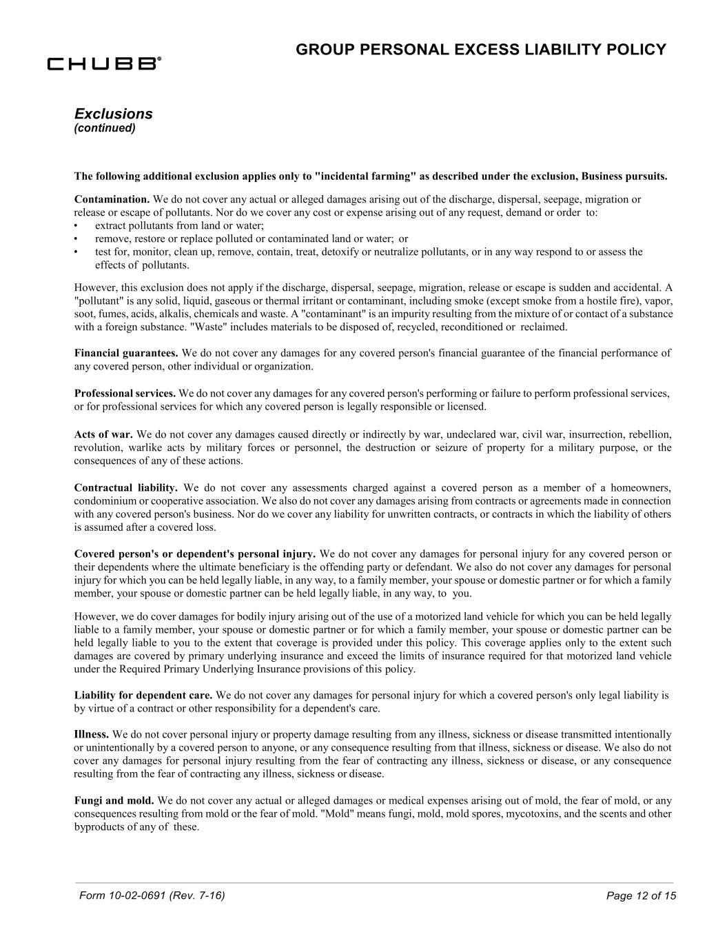 Form 10-02-0691 (Rev. 7-16) Page 12 of 15 Exclusions (continued) GROUP PERSONAL EXCESS LIABILITY POLICY The following additional exclusion applies only to "incidental farming" as described under the exclusion, Business pursuits. Contamination. We do not cover any actual or alleged damages arising out of the discharge, dispersal, seepage, migration or release or escape of pollutants. Nor do we cover any cost or expense arising out of any request, demand or order to: • extract pollutants from land or water; • remove, restore or replace polluted or contaminated land or water; or • test for, monitor, clean up, remove, contain, treat, detoxify or neutralize pollutants, or in any way respond to or assess the effects of pollutants. However, this exclusion does not apply if the discharge, dispersal, seepage, migration, release or escape is sudden and accidental. A "pollutant" is any solid, liquid, gaseous or thermal irritant or contaminant, including smoke (except smoke from a hostile fire), vapor, soot, fumes, acids, alkalis, chemicals and waste. A "contaminant" is an impurity resulting from the mixture of or contact of a substance with a foreign substance. "Waste" includes materials to be disposed of, recycled, reconditioned or reclaimed. Financial guarantees. We do not cover any damages for any covered person's financial guarantee of the financial performance of any covered person, other individual or organization. Professional services. We do not cover any damages for any covered person's performing or failure to perform professional services, or for professional services for which any covered person is legally responsible or licensed. Acts of war. We do not cover any damages caused directly or indirectly by war, undeclared war, civil war, insurrection, rebellion, revolution, warlike acts by military forces or personnel, the destruction or seizure of property for a military purpose, or the consequences of any of these actions. Contractual liability. We do not cover any assessments charged against a covered person as a member of a homeowners, condominium or cooperative association. We also do not cover any damages arising from contracts or agreements made in connection with any covered person's business. Nor do we cover any liability for unwritten contracts, or contracts in which the liability of others is assumed after a covered loss. Covered person's or dependent's personal injury. We do not cover any damages for personal injury for any covered person or their dependents where the ultimate beneficiary is the offending party or defendant. We also do not cover any damages for personal injury for which you can be held legally liable, in any way, to a family member, your spouse or domestic partner or for which a family member, your spouse or domestic partner can be held legally liable, in any way, to you. However, we do cover damages for bodily injury arising out of the use of a motorized land vehicle for which you can be held legally liable to a family member, your spouse or domestic partner or for which a family member, your spouse or domestic partner can be held legally liable to you to the extent that coverage is provided under this policy. This coverage applies only to the extent such damages are covered by primary underlying insurance and exceed the limits of insurance required for that motorized land vehicle under the Required Primary Underlying Insurance provisions of this policy. Liability for dependent care. We do not cover any damages for personal injury for which a covered person's only legal liability is by virtue of a contract or other responsibility for a dependent's care. Illness. We do not cover personal injury or property damage resulting from any illness, sickness or disease transmitted intentionally or unintentionally by a covered person to anyone, or any consequence resulting from that illness, sickness or disease. We also do not cover any damages for personal injury resulting from the fear of contracting any illness, sickness or disease, or any consequence resulting from the fear of contracting any illness, sickness or disease. Fungi and mold. We do not cover any actual or alleged damages or medical expenses arising out of mold, the fear of mold, or any consequences resulting from mold or the fear of mold. "Mold" means fungi, mold, mold spores, mycotoxins, and the scents and other byproducts of any of these.