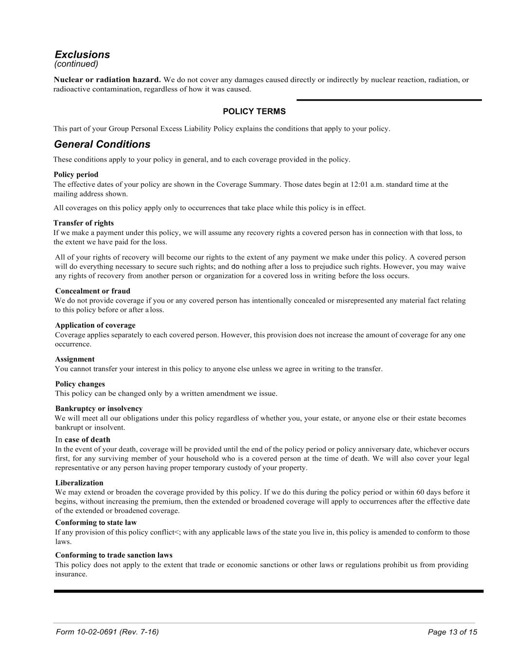 Form 10-02-0691 (Rev. 7-16) Page 13 of 15 Exclusions (continued) Nuclear or radiation hazard. We do not cover any damages caused directly or indirectly by nuclear reaction, radiation, or radioactive contamination, regardless of how it was caused. POLICY TERMS This part of your Group Personal Excess Liability Policy explains the conditions that apply to your policy. General Conditions These conditions apply to your policy in general, and to each coverage provided in the policy. Policy period The effective dates of your policy are shown in the Coverage Summary. Those dates begin at 12:01 a.m. standard time at the mailing address shown. All coverages on this policy apply only to occurrences that take place while this policy is in effect. Transfer of rights If we make a payment under this policy, we will assume any recovery rights a covered person has in connection with that loss, to the extent we have paid for the loss. All of your rights of recovery will become our rights to the extent of any payment we make under this policy. A covered person will do everything necessary to secure such rights; and do nothing after a loss to prejudice such rights. However, you may waive any rights of recovery from another person or organization for a covered loss in writing before the loss occurs. Concealment or fraud We do not provide coverage if you or any covered person has intentionally concealed or misrepresented any material fact relating to this policy before or after a loss. Application of coverage Coverage applies separately to each covered person. However, this provision does not increase the amount of coverage for any one occurrence. Assignment You cannot transfer your interest in this policy to anyone else unless we agree in writing to the transfer. Policy changes This policy can be changed only by a written amendment we issue. Bankruptcy or insolvency We will meet all our obligations under this policy regardless of whether you, your estate, or anyone else or their estate becomes bankrupt or insolvent. In case of death In the event of your death, coverage will be provided until the end of the policy period or policy anniversary date, whichever occurs first, for any surviving member of your household who is a covered person at the time of death. We will also cover your legal representative or any person having proper temporary custody of your property. Liberalization We may extend or broaden the coverage provided by this policy. If we do this during the policy period or within 60 days before it begins, without increasing the premium, then the extended or broadened coverage will apply to occurrences after the effective date of the extended or broadened coverage. Conforming to state law If any provision of this policy conflict<; with any applicable laws of the state you live in, this policy is amended to conform to those laws. Conforming to trade sanction laws This policy does not apply to the extent that trade or economic sanctions or other laws or regulations prohibit us from providing insurance.