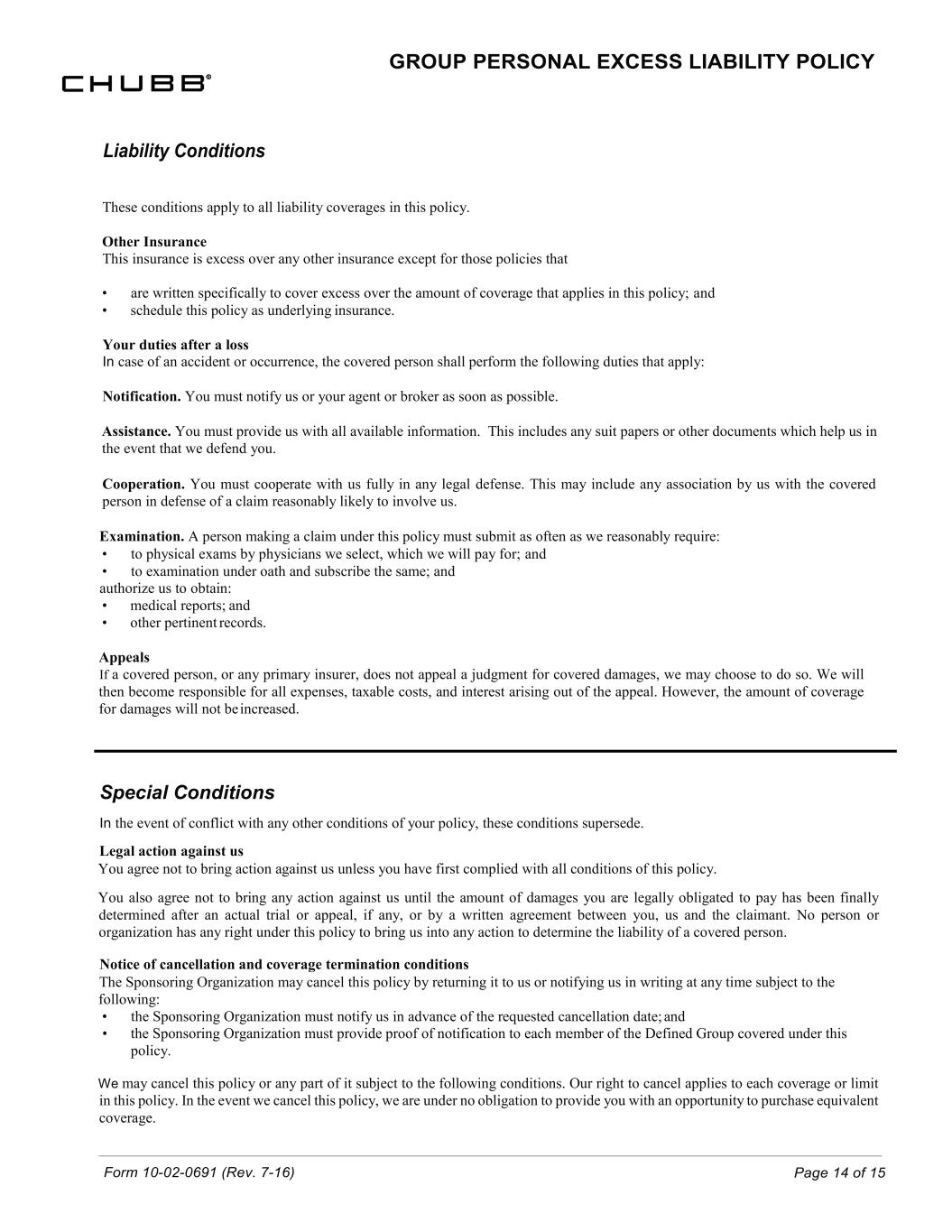Form 10-02-0691 (Rev. 7-16) Page 14 of 15 Liability Conditions GROUP PERSONAL EXCESS LIABILITY POLICY These conditions apply to all liability coverages in this policy. Other Insurance This insurance is excess over any other insurance except for those policies that • are written specifically to cover excess over the amount of coverage that applies in this policy; and • schedule this policy as underlying insurance. Your duties after a loss In case of an accident or occurrence, the covered person shall perform the following duties that apply: Notification. You must notify us or your agent or broker as soon as possible. Assistance. You must provide us with all available information. This includes any suit papers or other documents which help us in the event that we defend you. Cooperation. You must cooperate with us fully in any legal defense. This may include any association by us with the covered person in defense of a claim reasonably likely to involve us. Examination. A person making a claim under this policy must submit as often as we reasonably require: • to physical exams by physicians we select, which we will pay for; and • to examination under oath and subscribe the same; and authorize us to obtain: • medical reports; and • other pertinent records. Appeals If a covered person, or any primary insurer, does not appeal a judgment for covered damages, we may choose to do so. We will then become responsible for all expenses, taxable costs, and interest arising out of the appeal. However, the amount of coverage for damages will not be increased. Special Conditions In the event of conflict with any other conditions of your policy, these conditions supersede. Legal action against us You agree not to bring action against us unless you have first complied with all conditions of this policy. You also agree not to bring any action against us until the amount of damages you are legally obligated to pay has been finally determined after an actual trial or appeal, if any, or by a written agreement between you, us and the claimant. No person or organization has any right under this policy to bring us into any action to determine the liability of a covered person. Notice of cancellation and coverage termination conditions The Sponsoring Organization may cancel this policy by returning it to us or notifying us in writing at any time subject to the following: • the Sponsoring Organization must notify us in advance of the requested cancellation date; and • the Sponsoring Organization must provide proof of notification to each member of the Defined Group covered under this policy. We may cancel this policy or any part of it subject to the following conditions. Our right to cancel applies to each coverage or limit in this policy. In the event we cancel this policy, we are under no obligation to provide you with an opportunity to purchase equivalent coverage.