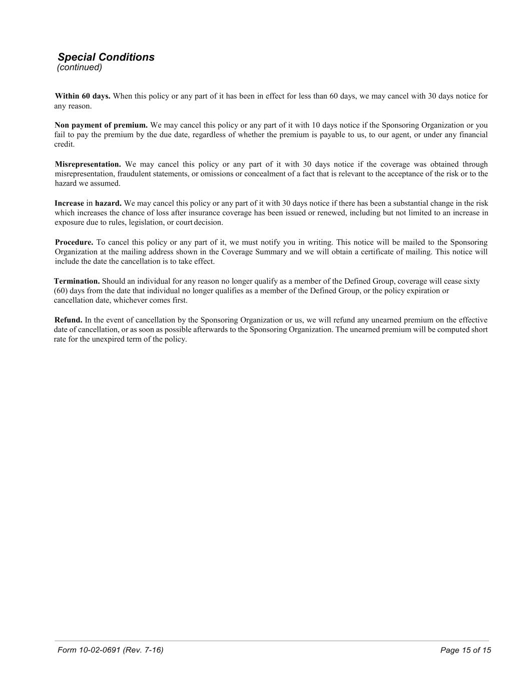 Form 10-02-0691 (Rev. 7-16) Page 15 of 15 Special Conditions (continued) Within 60 days. When this policy or any part of it has been in effect for less than 60 days, we may cancel with 30 days notice for any reason. Non payment of premium. We may cancel this policy or any part of it with 10 days notice if the Sponsoring Organization or you fail to pay the premium by the due date, regardless of whether the premium is payable to us, to our agent, or under any financial credit. Misrepresentation. We may cancel this policy or any part of it with 30 days notice if the coverage was obtained through misrepresentation, fraudulent statements, or omissions or concealment of a fact that is relevant to the acceptance of the risk or to the hazard we assumed. Increase in hazard. We may cancel this policy or any part of it with 30 days notice if there has been a substantial change in the risk which increases the chance of loss after insurance coverage has been issued or renewed, including but not limited to an increase in exposure due to rules, legislation, or court decision. Procedure. To cancel this policy or any part of it, we must notify you in writing. This notice will be mailed to the Sponsoring Organization at the mailing address shown in the Coverage Summary and we will obtain a certificate of mailing. This notice will include the date the cancellation is to take effect. Termination. Should an individual for any reason no longer qualify as a member of the Defined Group, coverage will cease sixty (60) days from the date that individual no longer qualifies as a member of the Defined Group, or the policy expiration or cancellation date, whichever comes first. Refund. In the event of cancellation by the Sponsoring Organization or us, we will refund any unearned premium on the effective date of cancellation, or as soon as possible afterwards to the Sponsoring Organization. The unearned premium will be computed short rate for the unexpired term of the policy.