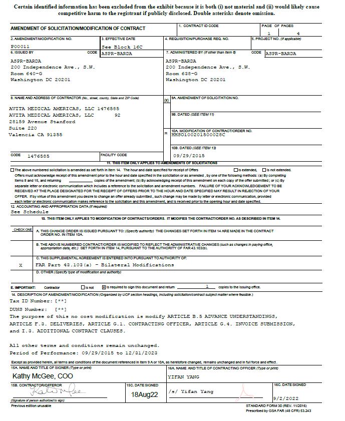 Certain identified information has been excluded from the exhibit because it is both (i) not material and (ii) would likely cause competitive harm to the registrant if publicly disclosed. Double asterisks denote omission.AMENDMENT OF SOLICITATION/MODIFICATION OF CONTRACT1. CONTRACT ID CODEPAGE OF PAGES142. AMENDMENT/MODIFICATION NO.P000113. EFFECTIVE DATESee Block 16C4. REQUISITION/PURCHASE REQ. NO.5. PROJECT NO. (If applicable)6. ISSUED BY CODE ASPR-BARDA 7. ADMINISTERED BY (If other than Item 6) CODE ASPR-BARDA ASPR-BARDA 200 Independence Ave., S.W.Room 640-G Washington DC 20201 ASPR-BARDA 200 Independence Ave., S.W. Room 638-G Washington DC 202018. NAME AND ADDRESS OF CONTRACTOR (No., street, county, State and ZIP Code) AVITA MEDICAL AMERICAS, LLC 1476585AVITA MEDICAL AMERICAS, LLC28159 Avenue StanfordSuite 220Valencia CA 9135592(x) 9A. AMENDMENT OF SOLICITATION NO. 9B. DATED (SEE ITEM 11) x 10A. MODIFICATION OF CONTRACT/ORDER NO. HHSO100201500028C CODE 1476585 FACILITY CODE10B. DATED (SEE ITEM 13)09/29/201511. THIS ITEM ONLY APPLIES TO AMENDMENTS OF SOLICITATIONSThe above numbered solicitation is amended as set forth in Item 14. The hour and date specified for receipt of Offers is extended,is not extended.Offers must acknowledge receipt of this amendment prior to the hour and date specified in the solicitation or as amended , by one of the following methods: (a) By completing Items 8 and 15, and returning copies of the amendment; (b) By acknowledging receipt of this amendment on each copy of the offer submitted ; or (c) By separate letter or electronic communication which includes a reference to the solicitation and amendment numbers. FAILURE OF YOUR ACKNOWLEDGEMENT TO BE RECEIVED AT THE PLACE DESIGNATED FOR THE RECEIPT OF OFFERS PRIOR TO THE HOUR AND DATE SPECIFIED MAY RESULT IN REJECTION OF YOUROFFER. If by virtue of this amendment you desire to change an offer already submitted , such change may be made by letter or electronic communication, provided each letter or electronic communication makes reference to the solicitation and this amendment, and is received prior to the opening hour and date specified. 12. ACCOUNTING AND APPROPRIATION DATA (If required)See Schedule13. THIS ITEM ONLY APPLIES TO MODIFICATION OF CONTRACTS/ORDERS. IT MODIFIES THE CONTRACT/ORDER NO. AS DESCRIBED IN ITEM 14.CHECK ONE  A. THIS CHANGE ORDER IS ISSUED PURSUANT TO: (Specify authority) THE CHANGES SET FORTH IN ITEM 14 ARE MADE IN THE CONTRACT ORDER NO. IN ITEM 10A.B. THE ABOVE NUMBERED CONTRACT/ORDER IS MODIFIED TO REFLECT THE ADMINISTRATIVE CHANGES (such as changes in paying office, appropriation data, etc.) SET FORTH IN ITEM 14, PURSUANT TO THE AUTHORITY OF FAR 43.103(b).C. THIS SUPPLEMENTAL AGREEMENT IS ENTERED INTO PURSUANT TO AUTHORITY OF:FAR Part 43.103(a) - Bilateral ModificationsD. OTHER (Specify type of modification and authority)E. IMPORTANT: Contractoris in Not isrequired to sign this document and return 1copies to the issuing office.14.DESCRIPTION OF AMENDMENT/MODIFICATION (Organized by UCF section headings, including solicitation/contract subject matter where feasible.)Tax ID Number: [**]DUNS Number:[**]The purpose of this no cost modification is modify ARTICLE B.5 ADVANCE UNDERSTANDINGS, ARTICLE F.3. DELIVERIES, ARTICLE G.1. CONTRACTING OFFICER, ARTICLE G.4. INVOICE SUBMISSION, and I.3. ADDITIONAL CONTRACT CLAUSES. All other terms and conditions remain unchanged. Period of Performance: 09/29/2015 to 12/31/2023Except as provided herein, all terms and conditions of the document referenced in Item 9 A or 10A, as heretofore changed, remains unchanged and in full force and effect15A. NAME AND TITLE OF SIGNER (Type or print 16A. NAME AND TITLE OF CONTRACTING OFFICER (Type or print Kathy McGee, COO16A. NAME AND TITLE OF CONTRACTING OFFICER (Type or print)YIFAN YANG15B. CONTRACTOR/OFFEROR15C. DATE SIGNED18Aug22(Signature of person authorized to sign)/s/ Yifan Yang16C. DATE SIGNED 9/2/2022STANDARD FORM 30 (REV. 11/2016)Prescribed by GSA FAR (48 CFR) 53.243Previous edition unusable