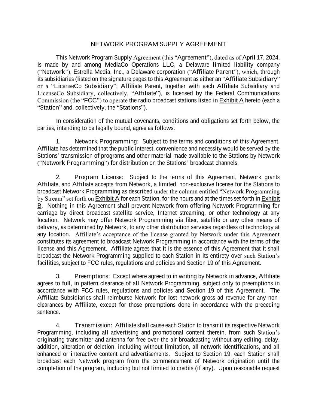 NETWORK PROGRAM SUPPLY AGREEMENT This Network Program Supply Agreement (this “Agreement”), dated as of April 17, 2024, is made by and among MediaCo Operations LLC, a Delaware limited liability company (“Network”), Estrella Media, Inc., a Delaware corporation (“Affiliate Parent”), which, through its subsidiaries (listed on the signature pages to this Agreement as either an “Affiliate Subsidiary” or a “LicenseCo Subsidiary”; Affiliate Parent, together with each Affiliate Subsidiary and LicenseCo Subsidiary, collectively, “Affiliate”), is licensed by the Federal Communications Commission (the “FCC”) to operate the radio broadcast stations listed in Exhibit A hereto (each a “Station” and, collectively, the “Stations”). In consideration of the mutual covenants, conditions and obligations set forth below, the parties, intending to be legally bound, agree as follows: 1. Network Programming: Subject to the terms and conditions of this Agreement, Affiliate has determined that the public interest, convenience and necessity would be served by the Stations’ transmission of programs and other material made available to the Stations by Network (“Network Programming”) for distribution on the Stations’ broadcast channels. 2. Program License: Subject to the terms of this Agreement, Network grants Affiliate, and Affiliate accepts from Network, a limited, non-exclusive license for the Stations to broadcast Network Programming as described under the column entitled “Network Programming by Stream” set forth on Exhibit A for each Station, for the hours and at the times set forth in Exhibit B. Nothing in this Agreement shall prevent Network from offering Network Programming for carriage by direct broadcast satellite service, Internet streaming, or other technology at any location. Network may offer Network Programming via fiber, satellite or any other means of delivery, as determined by Network, to any other distribution services regardless of technology at any location. Affiliate’s acceptance of the license granted by Network under this Agreement constitutes its agreement to broadcast Network Programming in accordance with the terms of the license and this Agreement. Affiliate agrees that it is the essence of this Agreement that it shall broadcast the Network Programming supplied to each Station in its entirety over such Station’s facilities, subject to FCC rules, regulations and policies and Section 19 of this Agreement. 3. Preemptions: Except where agreed to in writing by Network in advance, Affiliate agrees to full, in pattern clearance of all Network Programming, subject only to preemptions in accordance with FCC rules, regulations and policies and Section 19 of this Agreement. The Affiliate Subsidiaries shall reimburse Network for lost network gross ad revenue for any non- clearances by Affiliate, except for those preemptions done in accordance with the preceding sentence. 4. Transmission: Affiliate shall cause each Station to transmit its respective Network Programming, including all advertising and promotional content therein, from such Station’s originating transmitter and antenna for free over-the-air broadcasting without any editing, delay, addition, alteration or deletion, including without limitation, all network identifications, and all enhanced or interactive content and advertisements. Subject to Section 19, each Station shall broadcast each Network program from the commencement of Network origination until the completion of the program, including but not limited to credits (if any). Upon reasonable request