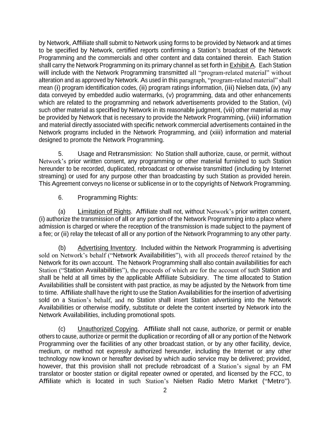 2 by Network, Affiliate shall submit to Network using forms to be provided by Network and at times to be specified by Network, certified reports confirming a Station’s broadcast of the Network Programming and the commercials and other content and data contained therein. Each Station shall carry the Network Programming on its primary channel as set forth in Exhibit A. Each Station will include with the Network Programming transmitted all “program-related material” without alteration and as approved by Network. As used in this paragraph, “program-related material” shall mean (i) program identification codes, (ii) program ratings information, (iii) Nielsen data, (iv) any data conveyed by embedded audio watermarks, (v) programming, data and other enhancements which are related to the programming and network advertisements provided to the Station, (vi) such other material as specified by Network in its reasonable judgment, (vii) other material as may be provided by Network that is necessary to provide the Network Programming, (viii) information and material directly associated with specific network commercial advertisements contained in the Network programs included in the Network Programming, and (xiii) information and material designed to promote the Network Programming. 5. Usage and Retransmission: No Station shall authorize, cause, or permit, without Network’s prior written consent, any programming or other material furnished to such Station hereunder to be recorded, duplicated, rebroadcast or otherwise transmitted (including by Internet streaming) or used for any purpose other than broadcasting by such Station as provided herein. This Agreement conveys no license or sublicense in or to the copyrights of Network Programming. 6. Programming Rights: (a) Limitation of Rights. Affiliate shall not, without Network’s prior written consent, (i) authorize the transmission of all or any portion of the Network Programming into a place where admission is charged or where the reception of the transmission is made subject to the payment of a fee; or (ii) relay the telecast of all or any portion of the Network Programming to any other party. (b) Advertising Inventory. Included within the Network Programming is advertising sold on Network’s behalf (“Network Availabilities”), with all proceeds thereof retained by the Network for its own account. The Network Programming shall also contain availabilities for each Station (“Station Availabilities”), the proceeds of which are for the account of such Station and shall be held at all times by the applicable Affiliate Subsidiary. The time allocated to Station Availabilities shall be consistent with past practice, as may be adjusted by the Network from time to time. Affiliate shall have the right to use the Station Availabilities for the insertion of advertising sold on a Station’s behalf, and no Station shall insert Station advertising into the Network Availabilities or otherwise modify, substitute or delete the content inserted by Network into the Network Availabilities, including promotional spots. (c) Unauthorized Copying. Affiliate shall not cause, authorize, or permit or enable others to cause, authorize or permit the duplication or recording of all or any portion of the Network Programming over the facilities of any other broadcast station, or by any other facility, device, medium, or method not expressly authorized hereunder, including the Internet or any other technology now known or hereafter devised by which audio service may be delivered; provided, however, that this provision shall not preclude rebroadcast of a Station’s signal by an FM translator or booster station or digital repeater owned or operated, and licensed by the FCC, to Affiliate which is located in such Station’s Nielsen Radio Metro Market (“Metro”).