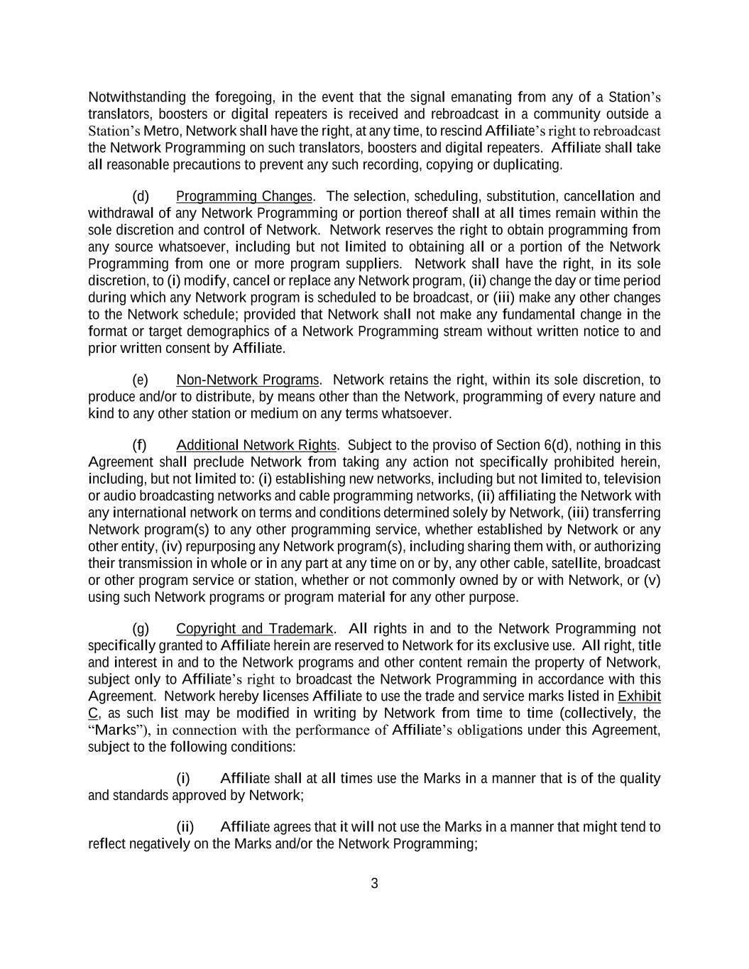 3 Notwithstanding the foregoing, in the event that the signal emanating from any of a Station’s translators, boosters or digital repeaters is received and rebroadcast in a community outside a Station’s Metro, Network shall have the right, at any time, to rescind Affiliate’s right to rebroadcast the Network Programming on such translators, boosters and digital repeaters. Affiliate shall take all reasonable precautions to prevent any such recording, copying or duplicating. (d) Programming Changes. The selection, scheduling, substitution, cancellation and withdrawal of any Network Programming or portion thereof shall at all times remain within the sole discretion and control of Network. Network reserves the right to obtain programming from any source whatsoever, including but not limited to obtaining all or a portion of the Network Programming from one or more program suppliers. Network shall have the right, in its sole discretion, to (i) modify, cancel or replace any Network program, (ii) change the day or time period during which any Network program is scheduled to be broadcast, or (iii) make any other changes to the Network schedule; provided that Network shall not make any fundamental change in the format or target demographics of a Network Programming stream without written notice to and prior written consent by Affiliate. (e) Non-Network Programs. Network retains the right, within its sole discretion, to produce and/or to distribute, by means other than the Network, programming of every nature and kind to any other station or medium on any terms whatsoever. (f) Additional Network Rights. Subject to the proviso of Section 6(d), nothing in this Agreement shall preclude Network from taking any action not specifically prohibited herein, including, but not limited to: (i) establishing new networks, including but not limited to, television or audio broadcasting networks and cable programming networks, (ii) affiliating the Network with any international network on terms and conditions determined solely by Network, (iii) transferring Network program(s) to any other programming service, whether established by Network or any other entity, (iv) repurposing any Network program(s), including sharing them with, or authorizing their transmission in whole or in any part at any time on or by, any other cable, satellite, broadcast or other program service or station, whether or not commonly owned by or with Network, or (v) using such Network programs or program material for any other purpose. (g) Copyright and Trademark. All rights in and to the Network Programming not specifically granted to Affiliate herein are reserved to Network for its exclusive use. All right, title and interest in and to the Network programs and other content remain the property of Network, subject only to Affiliate’s right to broadcast the Network Programming in accordance with this Agreement. Network hereby licenses Affiliate to use the trade and service marks listed in Exhibit C, as such list may be modified in writing by Network from time to time (collectively, the “Marks”), in connection with the performance of Affiliate’s obligations under this Agreement, subject to the following conditions: (i) Affiliate shall at all times use the Marks in a manner that is of the quality and standards approved by Network; (ii) Affiliate agrees that it will not use the Marks in a manner that might tend to reflect negatively on the Marks and/or the Network Programming;