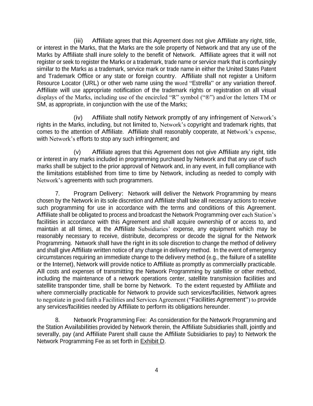 4 (iii) Affiliate agrees that this Agreement does not give Affiliate any right, title, or interest in the Marks, that the Marks are the sole property of Network and that any use of the Marks by Affiliate shall inure solely to the benefit of Network. Affiliate agrees that it will not register or seek to register the Marks or a trademark, trade name or service mark that is confusingly similar to the Marks as a trademark, service mark or trade name in either the United States Patent and Trademark Office or any state or foreign country. Affiliate shall not register a Uniform Resource Locator (URL) or other web name using the word “Estrella” or any variation thereof. Affiliate will use appropriate notification of the trademark rights or registration on all visual displays of the Marks, including use of the encircled “R” symbol (“®”) and/or the letters TM or SM, as appropriate, in conjunction with the use of the Marks; (iv) Affiliate shall notify Network promptly of any infringement of Network’s rights in the Marks, including, but not limited to, Network’s copyright and trademark rights, that comes to the attention of Affiliate. Affiliate shall reasonably cooperate, at Network’s expense, with Network’s efforts to stop any such infringement; and (v) Affiliate agrees that this Agreement does not give Affiliate any right, title or interest in any marks included in programming purchased by Network and that any use of such marks shall be subject to the prior approval of Network and, in any event, in full compliance with the limitations established from time to time by Network, including as needed to comply with Network’s agreements with such programmers. 7. Program Delivery: Network will deliver the Network Programming by means chosen by the Network in its sole discretion and Affiliate shall take all necessary actions to receive such programming for use in accordance with the terms and conditions of this Agreement. Affiliate shall be obligated to process and broadcast the Network Programming over each Station’s facilities in accordance with this Agreement and shall acquire ownership of or access to, and maintain at all times, at the Affiliate Subsidiaries’ expense, any equipment which may be reasonably necessary to receive, distribute, decompress or decode the signal for the Network Programming. Network shall have the right in its sole discretion to change the method of delivery and shall give Affiliate written notice of any change in delivery method. In the event of emergency circumstances requiring an immediate change to the delivery method (e.g., the failure of a satellite or the Internet), Network will provide notice to Affiliate as promptly as commercially practicable. All costs and expenses of transmitting the Network Programming by satellite or other method, including the maintenance of a network operations center, satellite transmission facilities and satellite transponder time, shall be borne by Network. To the extent requested by Affiliate and where commercially practicable for Network to provide such services/facilities, Network agrees to negotiate in good faith a Facilities and Services Agreement (“Facilities Agreement”) to provide any services/facilities needed by Affiliate to perform its obligations hereunder. 8. Network Programming Fee: As consideration for the Network Programming and the Station Availabilities provided by Network therein, the Affiliate Subsidiaries shall, jointly and severally, pay (and Affiliate Parent shall cause the Affiliate Subsidiaries to pay) to Network the Network Programming Fee as set forth in Exhibit D.