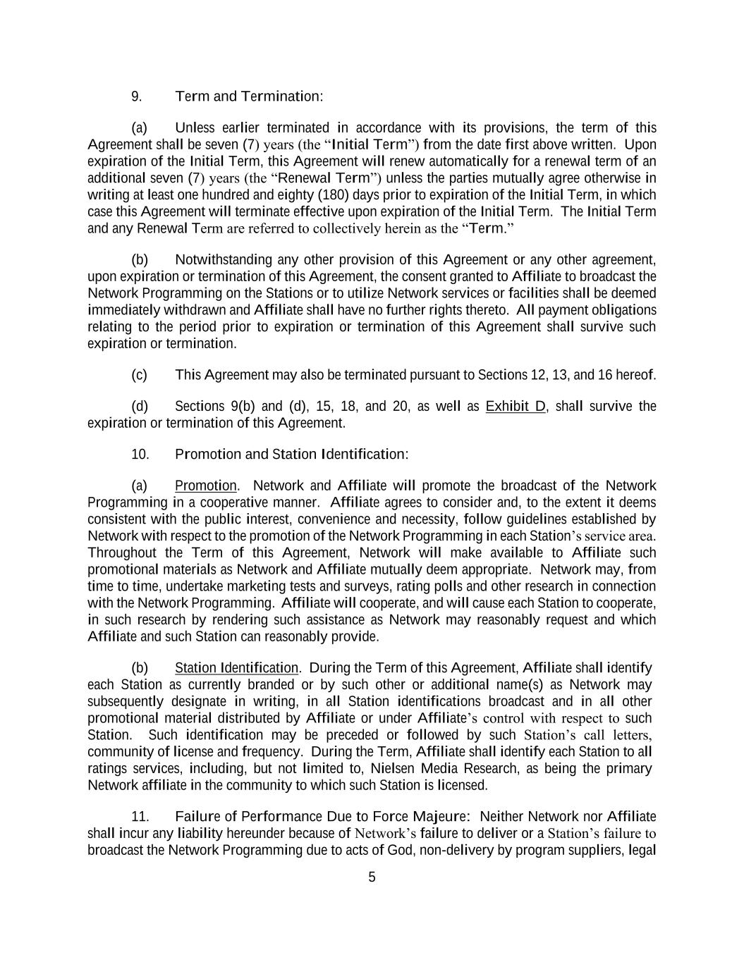 5 9. Term and Termination: (a) Unless earlier terminated in accordance with its provisions, the term of this Agreement shall be seven (7) years (the “Initial Term”) from the date first above written. Upon expiration of the Initial Term, this Agreement will renew automatically for a renewal term of an additional seven (7) years (the “Renewal Term”) unless the parties mutually agree otherwise in writing at least one hundred and eighty (180) days prior to expiration of the Initial Term, in which case this Agreement will terminate effective upon expiration of the Initial Term. The Initial Term and any Renewal Term are referred to collectively herein as the “Term.” (b) Notwithstanding any other provision of this Agreement or any other agreement, upon expiration or termination of this Agreement, the consent granted to Affiliate to broadcast the Network Programming on the Stations or to utilize Network services or facilities shall be deemed immediately withdrawn and Affiliate shall have no further rights thereto. All payment obligations relating to the period prior to expiration or termination of this Agreement shall survive such expiration or termination. (c) This Agreement may also be terminated pursuant to Sections 12, 13, and 16 hereof. (d) Sections 9(b) and (d), 15, 18, and 20, as well as Exhibit D, shall survive the expiration or termination of this Agreement. 10. Promotion and Station Identification: (a) Promotion. Network and Affiliate will promote the broadcast of the Network Programming in a cooperative manner. Affiliate agrees to consider and, to the extent it deems consistent with the public interest, convenience and necessity, follow guidelines established by Network with respect to the promotion of the Network Programming in each Station’s service area. Throughout the Term of this Agreement, Network will make available to Affiliate such promotional materials as Network and Affiliate mutually deem appropriate. Network may, from time to time, undertake marketing tests and surveys, rating polls and other research in connection with the Network Programming. Affiliate will cooperate, and will cause each Station to cooperate, in such research by rendering such assistance as Network may reasonably request and which Affiliate and such Station can reasonably provide. (b) Station Identification. During the Term of this Agreement, Affiliate shall identify each Station as currently branded or by such other or additional name(s) as Network may subsequently designate in writing, in all Station identifications broadcast and in all other promotional material distributed by Affiliate or under Affiliate’s control with respect to such Station. Such identification may be preceded or followed by such Station’s call letters, community of license and frequency. During the Term, Affiliate shall identify each Station to all ratings services, including, but not limited to, Nielsen Media Research, as being the primary Network affiliate in the community to which such Station is licensed. 11. Failure of Performance Due to Force Majeure: Neither Network nor Affiliate shall incur any liability hereunder because of Network’s failure to deliver or a Station’s failure to broadcast the Network Programming due to acts of God, non-delivery by program suppliers, legal