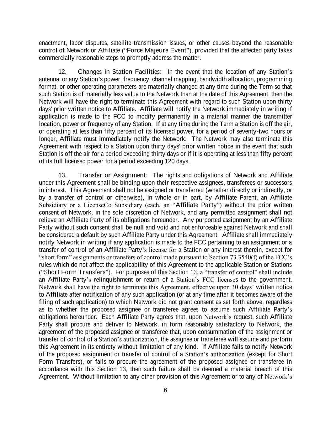 6 enactment, labor disputes, satellite transmission issues, or other causes beyond the reasonable control of Network or Affiliate (“Force Majeure Event”), provided that the affected party takes commercially reasonable steps to promptly address the matter. 12. Changes in Station Facilities: In the event that the location of any Station’s antenna, or any Station’s power, frequency, channel mapping, bandwidth allocation, programming format, or other operating parameters are materially changed at any time during the Term so that such Station is of materially less value to the Network than at the date of this Agreement, then the Network will have the right to terminate this Agreement with regard to such Station upon thirty days' prior written notice to Affiliate. Affiliate will notify the Network immediately in writing if application is made to the FCC to modify permanently in a material manner the transmitter location, power or frequency of any Station. If at any time during the Term a Station is off the air, or operating at less than fifty percent of its licensed power, for a period of seventy-two hours or longer, Affiliate must immediately notify the Network. The Network may also terminate this Agreement with respect to a Station upon thirty days' prior written notice in the event that such Station is off the air for a period exceeding thirty days or if it is operating at less than fifty percent of its full licensed power for a period exceeding 120 days. 13. Transfer or Assignment: The rights and obligations of Network and Affiliate under this Agreement shall be binding upon their respective assignees, transferees or successors in interest. This Agreement shall not be assigned or transferred (whether directly or indirectly, or by a transfer of control or otherwise), in whole or in part, by Affiliate Parent, an Affiliate Subsidiary or a LicenseCo Subsidiary (each, an “Affiliate Party”) without the prior written consent of Network, in the sole discretion of Network, and any permitted assignment shall not relieve an Affiliate Party of its obligations hereunder. Any purported assignment by an Affiliate Party without such consent shall be null and void and not enforceable against Network and shall be considered a default by such Affiliate Party under this Agreement. Affiliate shall immediately notify Network in writing if any application is made to the FCC pertaining to an assignment or a transfer of control of an Affiliate Party’s license for a Station or any interest therein, except for “short form” assignments or transfers of control made pursuant to Section 73.3540(f) of the FCC’s rules which do not affect the applicability of this Agreement to the applicable Station or Stations (“Short Form Transfers”). For purposes of this Section 13, a “transfer of control” shall include an Affiliate Party’s relinquishment or return of a Station’s FCC licenses to the government. Network shall have the right to terminate this Agreement, effective upon 30 days’ written notice to Affiliate after notification of any such application (or at any time after it becomes aware of the filing of such application) to which Network did not grant consent as set forth above, regardless as to whether the proposed assignee or transferee agrees to assume such Affiliate Party’s obligations hereunder. Each Affiliate Party agrees that, upon Network’s request, such Affiliate Party shall procure and deliver to Network, in form reasonably satisfactory to Network, the agreement of the proposed assignee or transferee that, upon consummation of the assignment or transfer of control of a Station’s authorization, the assignee or transferee will assume and perform this Agreement in its entirety without limitation of any kind. If Affiliate fails to notify Network of the proposed assignment or transfer of control of a Station’s authorization (except for Short Form Transfers), or fails to procure the agreement of the proposed assignee or transferee in accordance with this Section 13, then such failure shall be deemed a material breach of this Agreement. Without limitation to any other provision of this Agreement or to any of Network’s