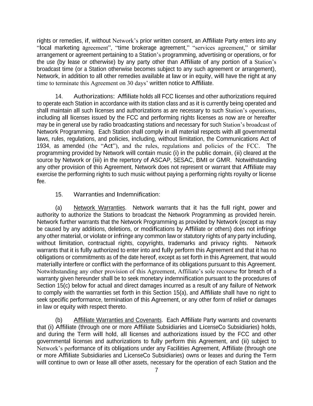 7 rights or remedies, if, without Network’s prior written consent, an Affiliate Party enters into any “local marketing agreement”, “time brokerage agreement,” “services agreement,” or similar arrangement or agreement pertaining to a Station’s programming, advertising or operations, or for the use (by lease or otherwise) by any party other than Affiliate of any portion of a Station’s broadcast time (or a Station otherwise becomes subject to any such agreement or arrangement), Network, in addition to all other remedies available at law or in equity, will have the right at any time to terminate this Agreement on 30 days’ written notice to Affiliate. 14. Authorizations: Affiliate holds all FCC licenses and other authorizations required to operate each Station in accordance with its station class and as it is currently being operated and shall maintain all such licenses and authorizations as are necessary to such Station’s operations, including all licenses issued by the FCC and performing rights licenses as now are or hereafter may be in general use by radio broadcasting stations and necessary for such Station’s broadcast of Network Programming. Each Station shall comply in all material respects with all governmental laws, rules, regulations, and policies, including, without limitation, the Communications Act of 1934, as amended (the “Act”), and the rules, regulations and policies of the FCC. The programming provided by Network will contain music (i) in the public domain, (ii) cleared at the source by Network or (iii) in the repertory of ASCAP, SESAC, BMI or GMR. Notwithstanding any other provision of this Agreement, Network does not represent or warrant that Affiliate may exercise the performing rights to such music without paying a performing rights royalty or license fee. 15. Warranties and Indemnification: (a) Network Warranties. Network warrants that it has the full right, power and authority to authorize the Stations to broadcast the Network Programming as provided herein. Network further warrants that the Network Programming as provided by Network (except as may be caused by any additions, deletions, or modifications by Affiliate or others) does not infringe any other material, or violate or infringe any common law or statutory rights of any party including, without limitation, contractual rights, copyrights, trademarks and privacy rights. Network warrants that it is fully authorized to enter into and fully perform this Agreement and that it has no obligations or commitments as of the date hereof, except as set forth in this Agreement, that would materially interfere or conflict with the performance of its obligations pursuant to this Agreement. Notwithstanding any other provision of this Agreement, Affiliate’s sole recourse for breach of a warranty given hereunder shall be to seek monetary indemnification pursuant to the procedures of Section 15(c) below for actual and direct damages incurred as a result of any failure of Network to comply with the warranties set forth in this Section 15(a), and Affiliate shall have no right to seek specific performance, termination of this Agreement, or any other form of relief or damages in law or equity with respect thereto. (b) Affiliate Warranties and Covenants. Each Affiliate Party warrants and covenants that (i) Affiliate (through one or more Affiliate Subsidiaries and LicenseCo Subsidiaries) holds, and during the Term will hold, all licenses and authorizations issued by the FCC and other governmental licenses and authorizations to fully perform this Agreement, and (ii) subject to Network’s performance of its obligations under any Facilities Agreement, Affiliate (through one or more Affiliate Subsidiaries and LicenseCo Subsidiaries) owns or leases and during the Term will continue to own or lease all other assets, necessary for the operation of each Station and the