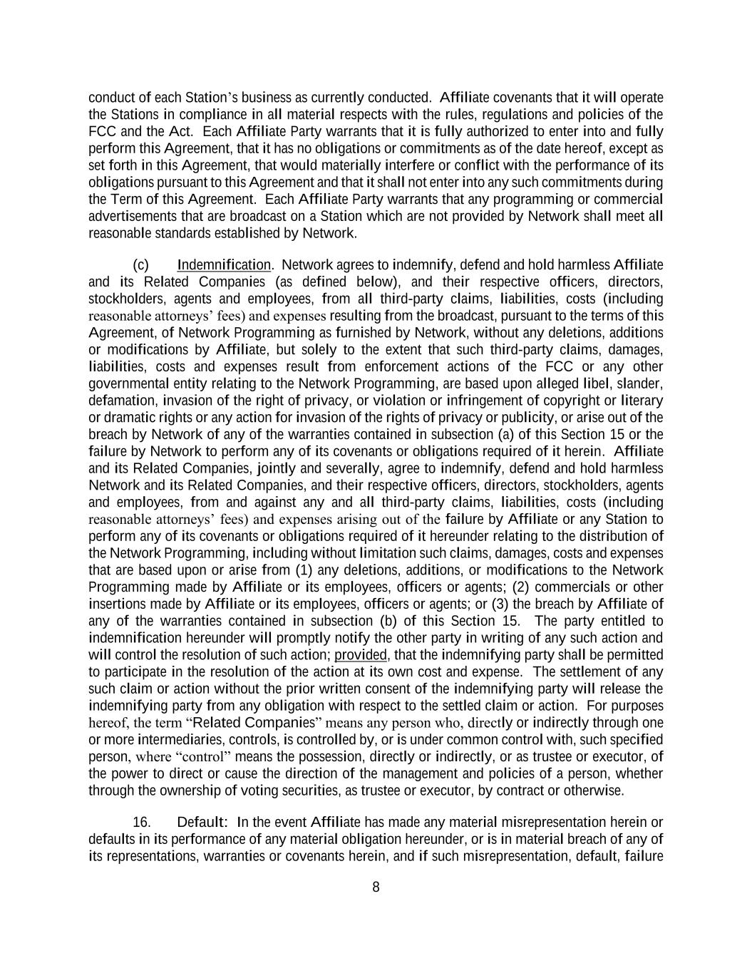 8 conduct of each Station’s business as currently conducted. Affiliate covenants that it will operate the Stations in compliance in all material respects with the rules, regulations and policies of the FCC and the Act. Each Affiliate Party warrants that it is fully authorized to enter into and fully perform this Agreement, that it has no obligations or commitments as of the date hereof, except as set forth in this Agreement, that would materially interfere or conflict with the performance of its obligations pursuant to this Agreement and that it shall not enter into any such commitments during the Term of this Agreement. Each Affiliate Party warrants that any programming or commercial advertisements that are broadcast on a Station which are not provided by Network shall meet all reasonable standards established by Network. (c) Indemnification. Network agrees to indemnify, defend and hold harmless Affiliate and its Related Companies (as defined below), and their respective officers, directors, stockholders, agents and employees, from all third-party claims, liabilities, costs (including reasonable attorneys’ fees) and expenses resulting from the broadcast, pursuant to the terms of this Agreement, of Network Programming as furnished by Network, without any deletions, additions or modifications by Affiliate, but solely to the extent that such third-party claims, damages, liabilities, costs and expenses result from enforcement actions of the FCC or any other governmental entity relating to the Network Programming, are based upon alleged libel, slander, defamation, invasion of the right of privacy, or violation or infringement of copyright or literary or dramatic rights or any action for invasion of the rights of privacy or publicity, or arise out of the breach by Network of any of the warranties contained in subsection (a) of this Section 15 or the failure by Network to perform any of its covenants or obligations required of it herein. Affiliate and its Related Companies, jointly and severally, agree to indemnify, defend and hold harmless Network and its Related Companies, and their respective officers, directors, stockholders, agents and employees, from and against any and all third-party claims, liabilities, costs (including reasonable attorneys’ fees) and expenses arising out of the failure by Affiliate or any Station to perform any of its covenants or obligations required of it hereunder relating to the distribution of the Network Programming, including without limitation such claims, damages, costs and expenses that are based upon or arise from (1) any deletions, additions, or modifications to the Network Programming made by Affiliate or its employees, officers or agents; (2) commercials or other insertions made by Affiliate or its employees, officers or agents; or (3) the breach by Affiliate of any of the warranties contained in subsection (b) of this Section 15. The party entitled to indemnification hereunder will promptly notify the other party in writing of any such action and will control the resolution of such action; provided, that the indemnifying party shall be permitted to participate in the resolution of the action at its own cost and expense. The settlement of any such claim or action without the prior written consent of the indemnifying party will release the indemnifying party from any obligation with respect to the settled claim or action. For purposes hereof, the term “Related Companies” means any person who, directly or indirectly through one or more intermediaries, controls, is controlled by, or is under common control with, such specified person, where “control” means the possession, directly or indirectly, or as trustee or executor, of the power to direct or cause the direction of the management and policies of a person, whether through the ownership of voting securities, as trustee or executor, by contract or otherwise. 16. Default: In the event Affiliate has made any material misrepresentation herein or defaults in its performance of any material obligation hereunder, or is in material breach of any of its representations, warranties or covenants herein, and if such misrepresentation, default, failure