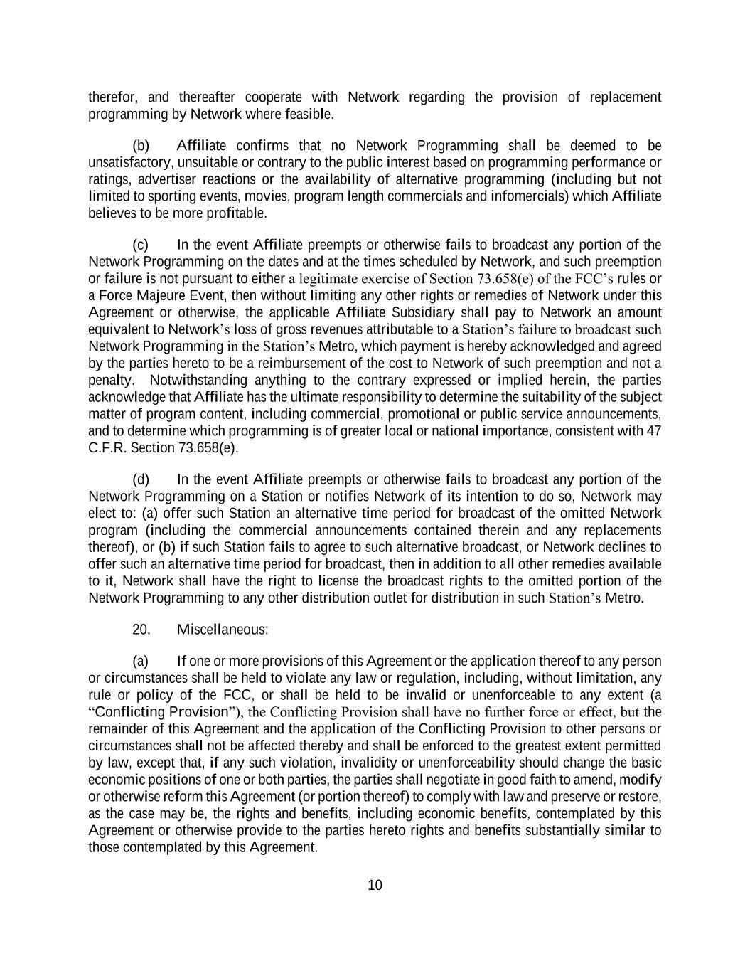 10 therefor, and thereafter cooperate with Network regarding the provision of replacement programming by Network where feasible. (b) Affiliate confirms that no Network Programming shall be deemed to be unsatisfactory, unsuitable or contrary to the public interest based on programming performance or ratings, advertiser reactions or the availability of alternative programming (including but not limited to sporting events, movies, program length commercials and infomercials) which Affiliate believes to be more profitable. (c) In the event Affiliate preempts or otherwise fails to broadcast any portion of the Network Programming on the dates and at the times scheduled by Network, and such preemption or failure is not pursuant to either a legitimate exercise of Section 73.658(e) of the FCC’s rules or a Force Majeure Event, then without limiting any other rights or remedies of Network under this Agreement or otherwise, the applicable Affiliate Subsidiary shall pay to Network an amount equivalent to Network’s loss of gross revenues attributable to a Station’s failure to broadcast such Network Programming in the Station’s Metro, which payment is hereby acknowledged and agreed by the parties hereto to be a reimbursement of the cost to Network of such preemption and not a penalty. Notwithstanding anything to the contrary expressed or implied herein, the parties acknowledge that Affiliate has the ultimate responsibility to determine the suitability of the subject matter of program content, including commercial, promotional or public service announcements, and to determine which programming is of greater local or national importance, consistent with 47 C.F.R. Section 73.658(e). (d) In the event Affiliate preempts or otherwise fails to broadcast any portion of the Network Programming on a Station or notifies Network of its intention to do so, Network may elect to: (a) offer such Station an alternative time period for broadcast of the omitted Network program (including the commercial announcements contained therein and any replacements thereof), or (b) if such Station fails to agree to such alternative broadcast, or Network declines to offer such an alternative time period for broadcast, then in addition to all other remedies available to it, Network shall have the right to license the broadcast rights to the omitted portion of the Network Programming to any other distribution outlet for distribution in such Station’s Metro. 20. Miscellaneous: (a) If one or more provisions of this Agreement or the application thereof to any person or circumstances shall be held to violate any law or regulation, including, without limitation, any rule or policy of the FCC, or shall be held to be invalid or unenforceable to any extent (a “Conflicting Provision”), the Conflicting Provision shall have no further force or effect, but the remainder of this Agreement and the application of the Conflicting Provision to other persons or circumstances shall not be affected thereby and shall be enforced to the greatest extent permitted by law, except that, if any such violation, invalidity or unenforceability should change the basic economic positions of one or both parties, the parties shall negotiate in good faith to amend, modify or otherwise reform this Agreement (or portion thereof) to comply with law and preserve or restore, as the case may be, the rights and benefits, including economic benefits, contemplated by this Agreement or otherwise provide to the parties hereto rights and benefits substantially similar to those contemplated by this Agreement.