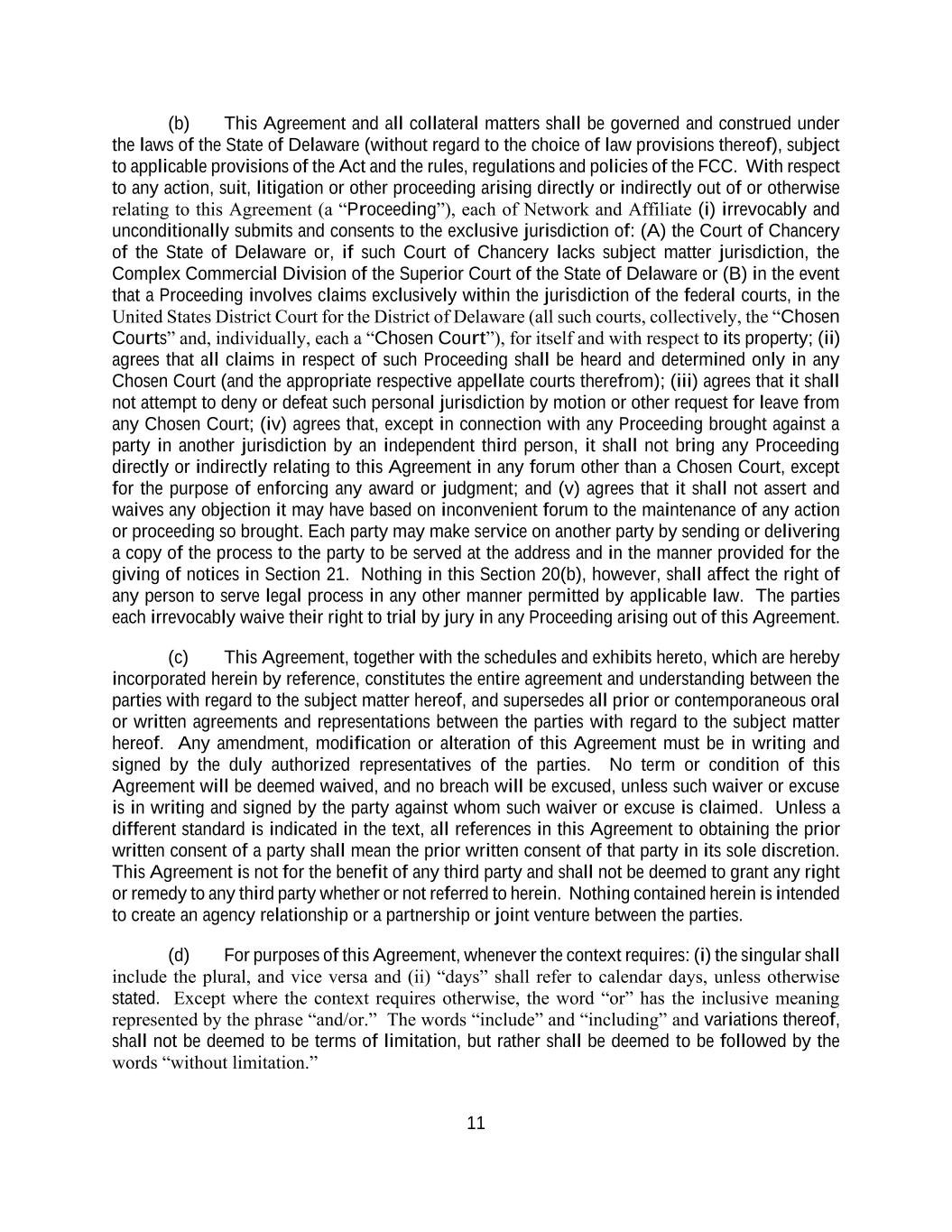 11 (b) This Agreement and all collateral matters shall be governed and construed under the laws of the State of Delaware (without regard to the choice of law provisions thereof), subject to applicable provisions of the Act and the rules, regulations and policies of the FCC. With respect to any action, suit, litigation or other proceeding arising directly or indirectly out of or otherwise relating to this Agreement (a “Proceeding”), each of Network and Affiliate (i) irrevocably and unconditionally submits and consents to the exclusive jurisdiction of: (A) the Court of Chancery of the State of Delaware or, if such Court of Chancery lacks subject matter jurisdiction, the Complex Commercial Division of the Superior Court of the State of Delaware or (B) in the event that a Proceeding involves claims exclusively within the jurisdiction of the federal courts, in the United States District Court for the District of Delaware (all such courts, collectively, the “Chosen Courts” and, individually, each a “Chosen Court”), for itself and with respect to its property; (ii) agrees that all claims in respect of such Proceeding shall be heard and determined only in any Chosen Court (and the appropriate respective appellate courts therefrom); (iii) agrees that it shall not attempt to deny or defeat such personal jurisdiction by motion or other request for leave from any Chosen Court; (iv) agrees that, except in connection with any Proceeding brought against a party in another jurisdiction by an independent third person, it shall not bring any Proceeding directly or indirectly relating to this Agreement in any forum other than a Chosen Court, except for the purpose of enforcing any award or judgment; and (v) agrees that it shall not assert and waives any objection it may have based on inconvenient forum to the maintenance of any action or proceeding so brought. Each party may make service on another party by sending or delivering a copy of the process to the party to be served at the address and in the manner provided for the giving of notices in Section 21. Nothing in this Section 20(b), however, shall affect the right of any person to serve legal process in any other manner permitted by applicable law. The parties each irrevocably waive their right to trial by jury in any Proceeding arising out of this Agreement. (c) This Agreement, together with the schedules and exhibits hereto, which are hereby incorporated herein by reference, constitutes the entire agreement and understanding between the parties with regard to the subject matter hereof, and supersedes all prior or contemporaneous oral or written agreements and representations between the parties with regard to the subject matter hereof. Any amendment, modification or alteration of this Agreement must be in writing and signed by the duly authorized representatives of the parties. No term or condition of this Agreement will be deemed waived, and no breach will be excused, unless such waiver or excuse is in writing and signed by the party against whom such waiver or excuse is claimed. Unless a different standard is indicated in the text, all references in this Agreement to obtaining the prior written consent of a party shall mean the prior written consent of that party in its sole discretion. This Agreement is not for the benefit of any third party and shall not be deemed to grant any right or remedy to any third party whether or not referred to herein. Nothing contained herein is intended to create an agency relationship or a partnership or joint venture between the parties. (d) For purposes of this Agreement, whenever the context requires: (i) the singular shall include the plural, and vice versa and (ii) “days” shall refer to calendar days, unless otherwise stated. Except where the context requires otherwise, the word “or” has the inclusive meaning represented by the phrase “and/or.” The words “include” and “including” and variations thereof, shall not be deemed to be terms of limitation, but rather shall be deemed to be followed by the words “without limitation.”