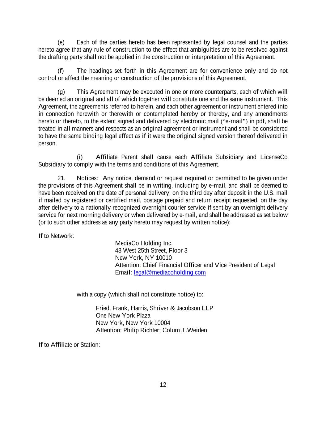 12 (e) Each of the parties hereto has been represented by legal counsel and the parties hereto agree that any rule of construction to the effect that ambiguities are to be resolved against the drafting party shall not be applied in the construction or interpretation of this Agreement. (f) The headings set forth in this Agreement are for convenience only and do not control or affect the meaning or construction of the provisions of this Agreement. (g) This Agreement may be executed in one or more counterparts, each of which will be deemed an original and all of which together will constitute one and the same instrument. This Agreement, the agreements referred to herein, and each other agreement or instrument entered into in connection herewith or therewith or contemplated hereby or thereby, and any amendments hereto or thereto, to the extent signed and delivered by electronic mail (“e-mail”) in pdf, shall be treated in all manners and respects as an original agreement or instrument and shall be considered to have the same binding legal effect as if it were the original signed version thereof delivered in person. (i) Affiliate Parent shall cause each Affiliate Subsidiary and LicenseCo Subsidiary to comply with the terms and conditions of this Agreement. 21. Notices: Any notice, demand or request required or permitted to be given under the provisions of this Agreement shall be in writing, including by e-mail, and shall be deemed to have been received on the date of personal delivery, on the third day after deposit in the U.S. mail if mailed by registered or certified mail, postage prepaid and return receipt requested, on the day after delivery to a nationally recognized overnight courier service if sent by an overnight delivery service for next morning delivery or when delivered by e-mail, and shall be addressed as set below (or to such other address as any party hereto may request by written notice): If to Network: MediaCo Holding Inc. 48 West 25th Street, Floor 3 New York, NY 10010 Attention: Chief Financial Officer and Vice President of Legal Email: legal@mediacoholding.com with a copy (which shall not constitute notice) to: Fried, Frank, Harris, Shriver & Jacobson LLP One New York Plaza New York, New York 10004 Attention: Philip Richter; Colum J .Weiden If to Affiliate or Station: