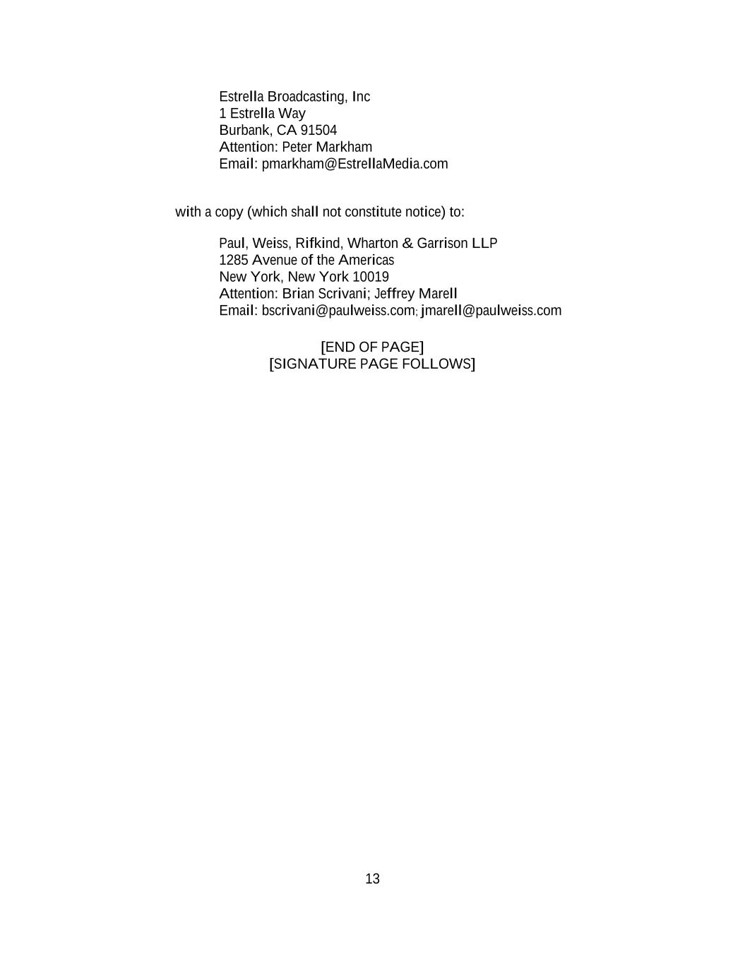 13 Estrella Broadcasting, Inc 1 Estrella Way Burbank, CA 91504 Attention: Peter Markham Email: pmarkham@EstrellaMedia.com with a copy (which shall not constitute notice) to: Paul, Weiss, Rifkind, Wharton & Garrison LLP 1285 Avenue of the Americas New York, New York 10019 Attention: Brian Scrivani; Jeffrey Marell Email: bscrivani@paulweiss.com; jmarell@paulweiss.com [END OF PAGE] [SIGNATURE PAGE FOLLOWS]
