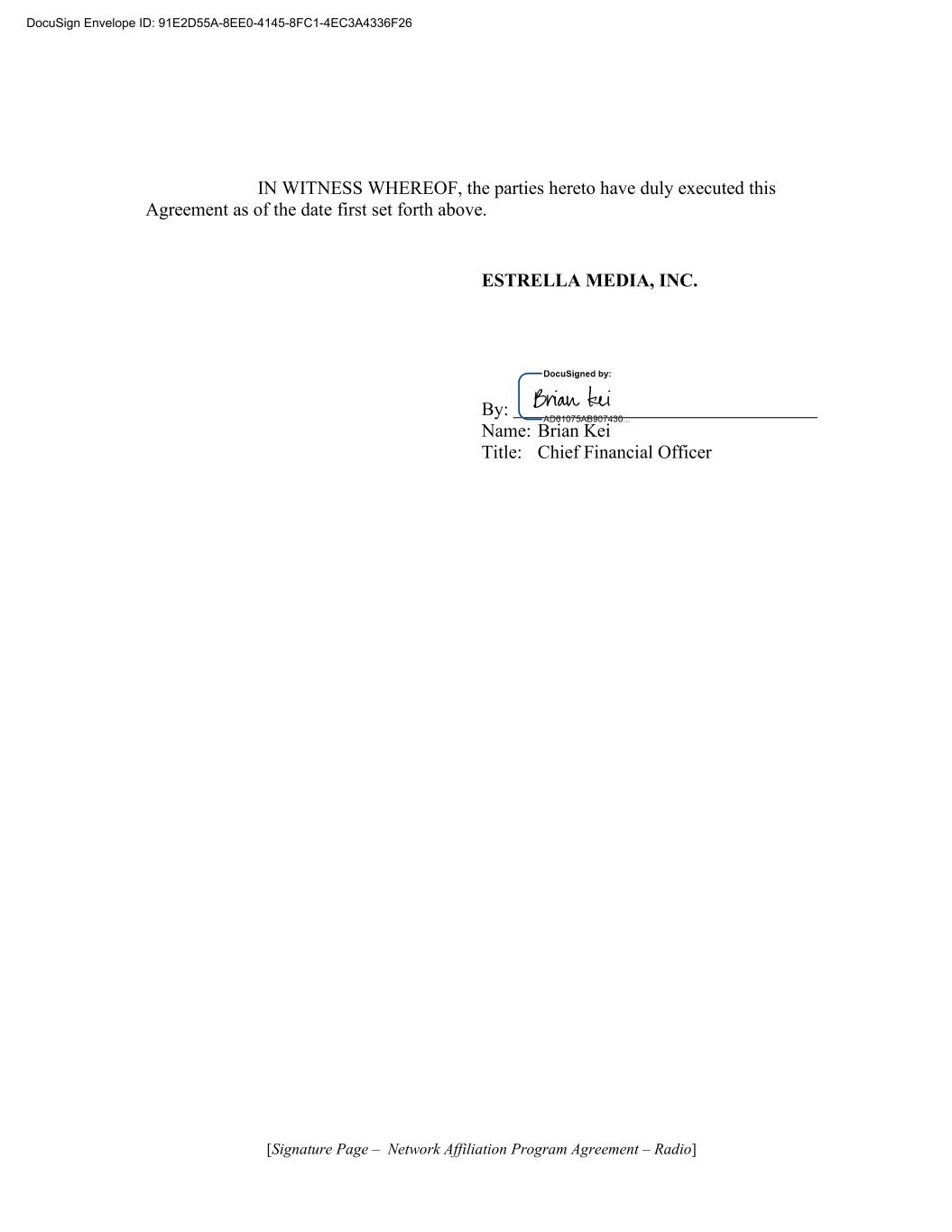 [Signature Page – Network Affiliation Program Agreement – Radio] IN WITNESS WHEREOF, the parties hereto have duly executed this Agreement as of the date first set forth above. ESTRELLA MEDIA, INC. By: Name: Brian Kei Title: Chief Financial Officer DocuSign Envelope ID: 91E2D55A-8EE0-4145-8FC1-4EC3A4336F26