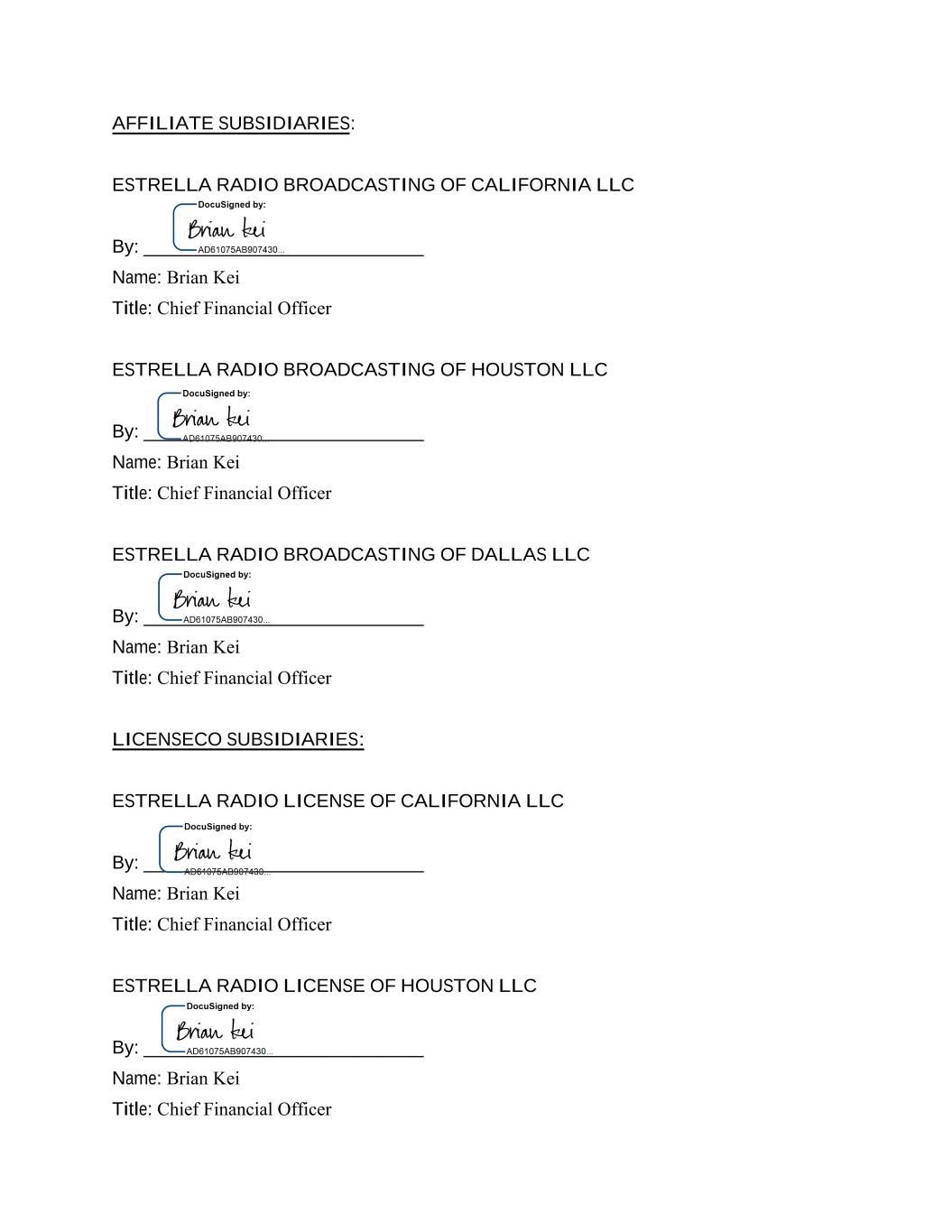 AFFILIATE SUBSIDIARIES: ESTRELLA RADIO BROADCASTING OF CALIFORNIA LLC By: ______________________________ Name: Brian Kei Title: Chief Financial Officer ESTRELLA RADIO BROADCASTING OF HOUSTON LLC By: ______________________________ Name: Brian Kei Title: Chief Financial Officer ESTRELLA RADIO BROADCASTING OF DALLAS LLC By: ______________________________ Name: Brian Kei Title: Chief Financial Officer LICENSECO SUBSIDIARIES: ESTRELLA RADIO LICENSE OF CALIFORNIA LLC By: ______________________________ Name: Brian Kei Title: Chief Financial Officer ESTRELLA RADIO LICENSE OF HOUSTON LLC By: ______________________________ Name: Brian Kei Title: Chief Financial Officer
