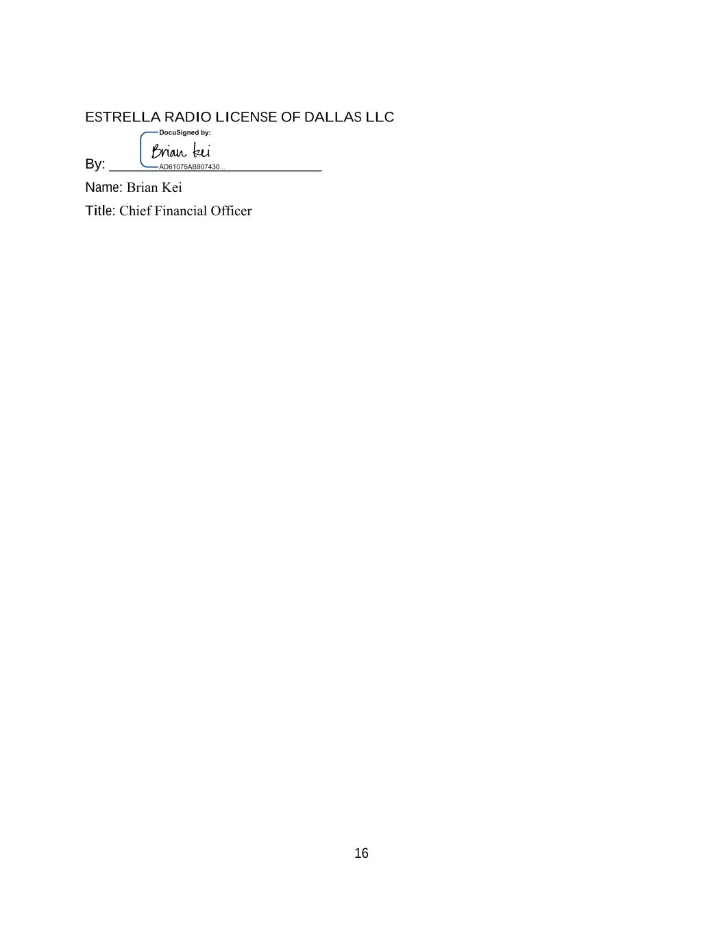 16 ESTRELLA RADIO LICENSE OF DALLAS LLC By: ______________________________ Name: Brian Kei Title: Chief Financial Officer