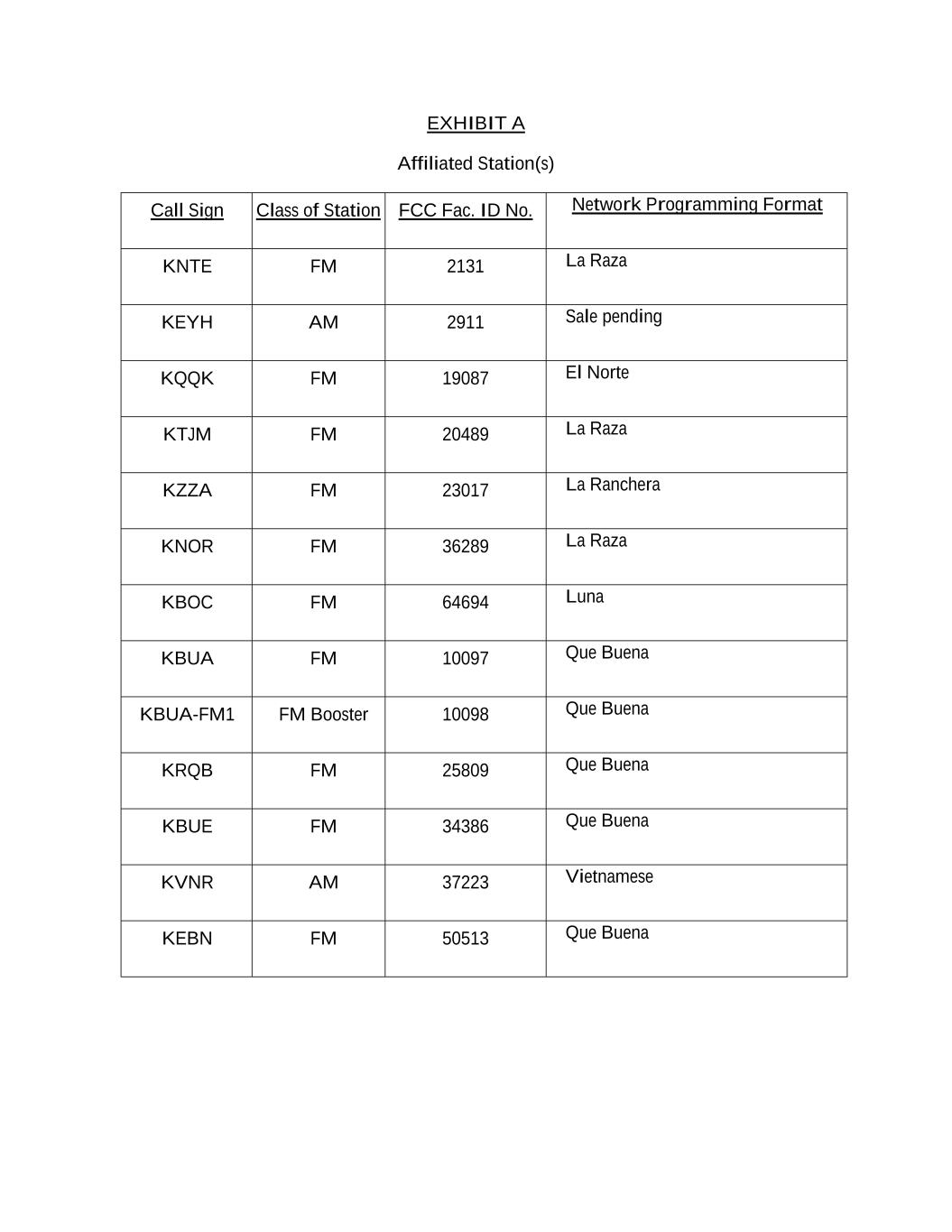 EXHIBIT A Affiliated Station(s) Call Sign Class of Station FCC Fac. ID No. Network Programming Format KNTE FM 2131 La Raza KEYH AM 2911 Sale pending KQQK FM 19087 El Norte KTJM FM 20489 La Raza KZZA FM 23017 La Ranchera KNOR FM 36289 La Raza KBOC FM 64694 Luna KBUA FM 10097 Que Buena KBUA-FM1 FM Booster 10098 Que Buena KRQB FM 25809 Que Buena KBUE FM 34386 Que Buena KVNR AM 37223 Vietnamese KEBN FM 50513 Que Buena