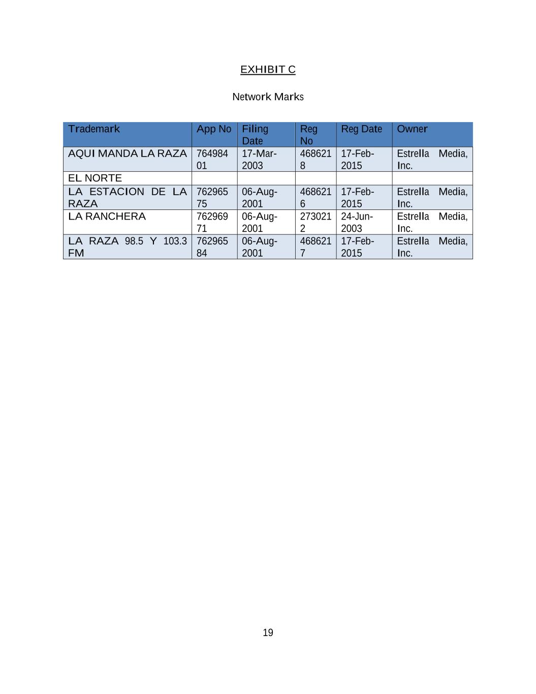 19 EXHIBIT C Network Marks Trademark App No Filing Date Reg No Reg Date Owner AQUI MANDA LA RAZA 764984 01 17-Mar- 2003 468621 8 17-Feb- 2015 Estrella Media, Inc. EL NORTE LA ESTACION DE LA RAZA 762965 75 06-Aug- 2001 468621 6 17-Feb- 2015 Estrella Media, Inc. LA RANCHERA 762969 71 06-Aug- 2001 273021 2 24-Jun- 2003 Estrella Media, Inc. LA RAZA 98.5 Y 103.3 FM 762965 84 06-Aug- 2001 468621 7 17-Feb- 2015 Estrella Media, Inc.