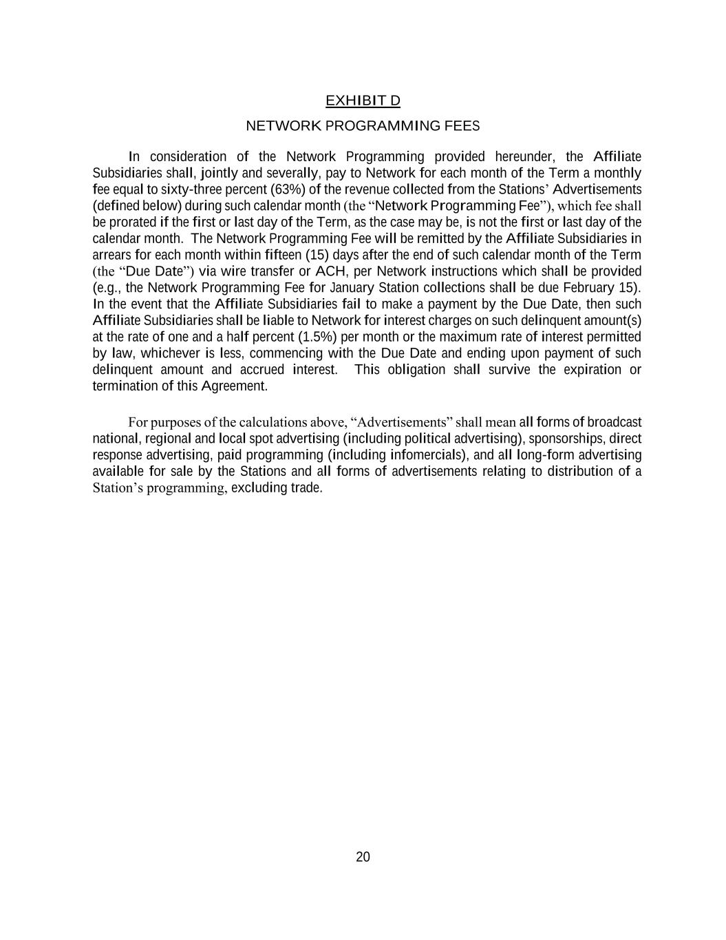 20 EXHIBIT D NETWORK PROGRAMMING FEES In consideration of the Network Programming provided hereunder, the Affiliate Subsidiaries shall, jointly and severally, pay to Network for each month of the Term a monthly fee equal to sixty-three percent (63%) of the revenue collected from the Stations’ Advertisements (defined below) during such calendar month (the “Network Programming Fee”), which fee shall be prorated if the first or last day of the Term, as the case may be, is not the first or last day of the calendar month. The Network Programming Fee will be remitted by the Affiliate Subsidiaries in arrears for each month within fifteen (15) days after the end of such calendar month of the Term (the “Due Date”) via wire transfer or ACH, per Network instructions which shall be provided (e.g., the Network Programming Fee for January Station collections shall be due February 15). In the event that the Affiliate Subsidiaries fail to make a payment by the Due Date, then such Affiliate Subsidiaries shall be liable to Network for interest charges on such delinquent amount(s) at the rate of one and a half percent (1.5%) per month or the maximum rate of interest permitted by law, whichever is less, commencing with the Due Date and ending upon payment of such delinquent amount and accrued interest. This obligation shall survive the expiration or termination of this Agreement. For purposes of the calculations above, “Advertisements” shall mean all forms of broadcast national, regional and local spot advertising (including political advertising), sponsorships, direct response advertising, paid programming (including infomercials), and all long-form advertising available for sale by the Stations and all forms of advertisements relating to distribution of a Station’s programming, excluding trade.