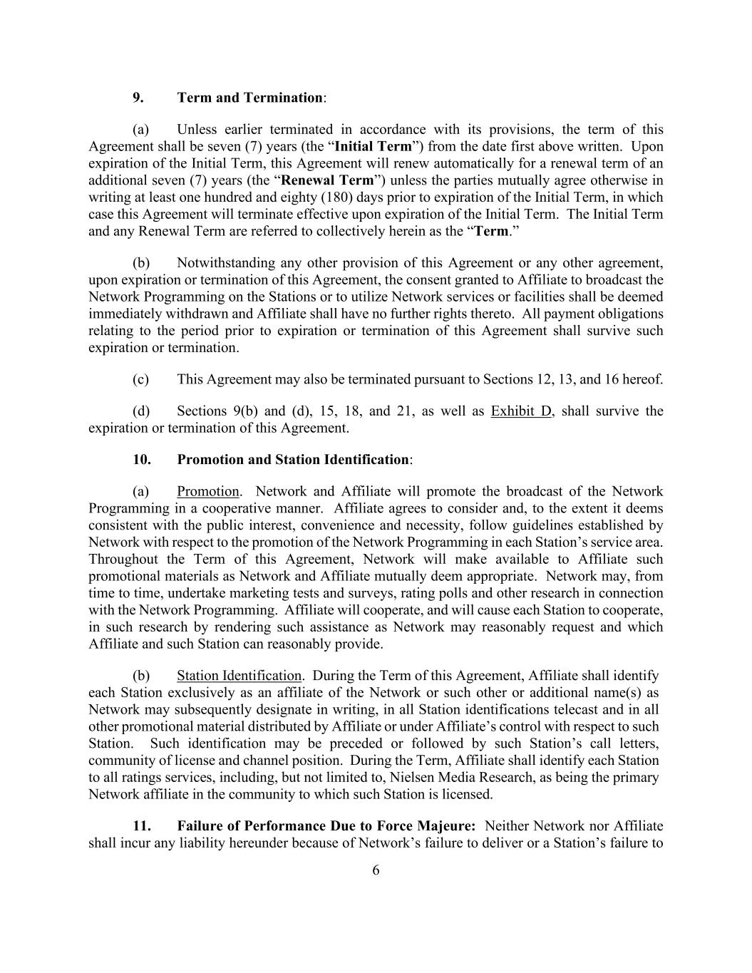 6 9. Term and Termination: (a) Unless earlier terminated in accordance with its provisions, the term of this Agreement shall be seven (7) years (the “Initial Term”) from the date first above written. Upon expiration of the Initial Term, this Agreement will renew automatically for a renewal term of an additional seven (7) years (the “Renewal Term”) unless the parties mutually agree otherwise in writing at least one hundred and eighty (180) days prior to expiration of the Initial Term, in which case this Agreement will terminate effective upon expiration of the Initial Term. The Initial Term and any Renewal Term are referred to collectively herein as the “Term.” (b) Notwithstanding any other provision of this Agreement or any other agreement, upon expiration or termination of this Agreement, the consent granted to Affiliate to broadcast the Network Programming on the Stations or to utilize Network services or facilities shall be deemed immediately withdrawn and Affiliate shall have no further rights thereto. All payment obligations relating to the period prior to expiration or termination of this Agreement shall survive such expiration or termination. (c) This Agreement may also be terminated pursuant to Sections 12, 13, and 16 hereof. (d) Sections 9(b) and (d), 15, 18, and 21, as well as Exhibit D, shall survive the expiration or termination of this Agreement. 10. Promotion and Station Identification: (a) Promotion. Network and Affiliate will promote the broadcast of the Network Programming in a cooperative manner. Affiliate agrees to consider and, to the extent it deems consistent with the public interest, convenience and necessity, follow guidelines established by Network with respect to the promotion of the Network Programming in each Station’s service area. Throughout the Term of this Agreement, Network will make available to Affiliate such promotional materials as Network and Affiliate mutually deem appropriate. Network may, from time to time, undertake marketing tests and surveys, rating polls and other research in connection with the Network Programming. Affiliate will cooperate, and will cause each Station to cooperate, in such research by rendering such assistance as Network may reasonably request and which Affiliate and such Station can reasonably provide. (b) Station Identification. During the Term of this Agreement, Affiliate shall identify each Station exclusively as an affiliate of the Network or such other or additional name(s) as Network may subsequently designate in writing, in all Station identifications telecast and in all other promotional material distributed by Affiliate or under Affiliate’s control with respect to such Station. Such identification may be preceded or followed by such Station’s call letters, community of license and channel position. During the Term, Affiliate shall identify each Station to all ratings services, including, but not limited to, Nielsen Media Research, as being the primary Network affiliate in the community to which such Station is licensed. 11. Failure of Performance Due to Force Majeure: Neither Network nor Affiliate shall incur any liability hereunder because of Network’s failure to deliver or a Station’s failure to