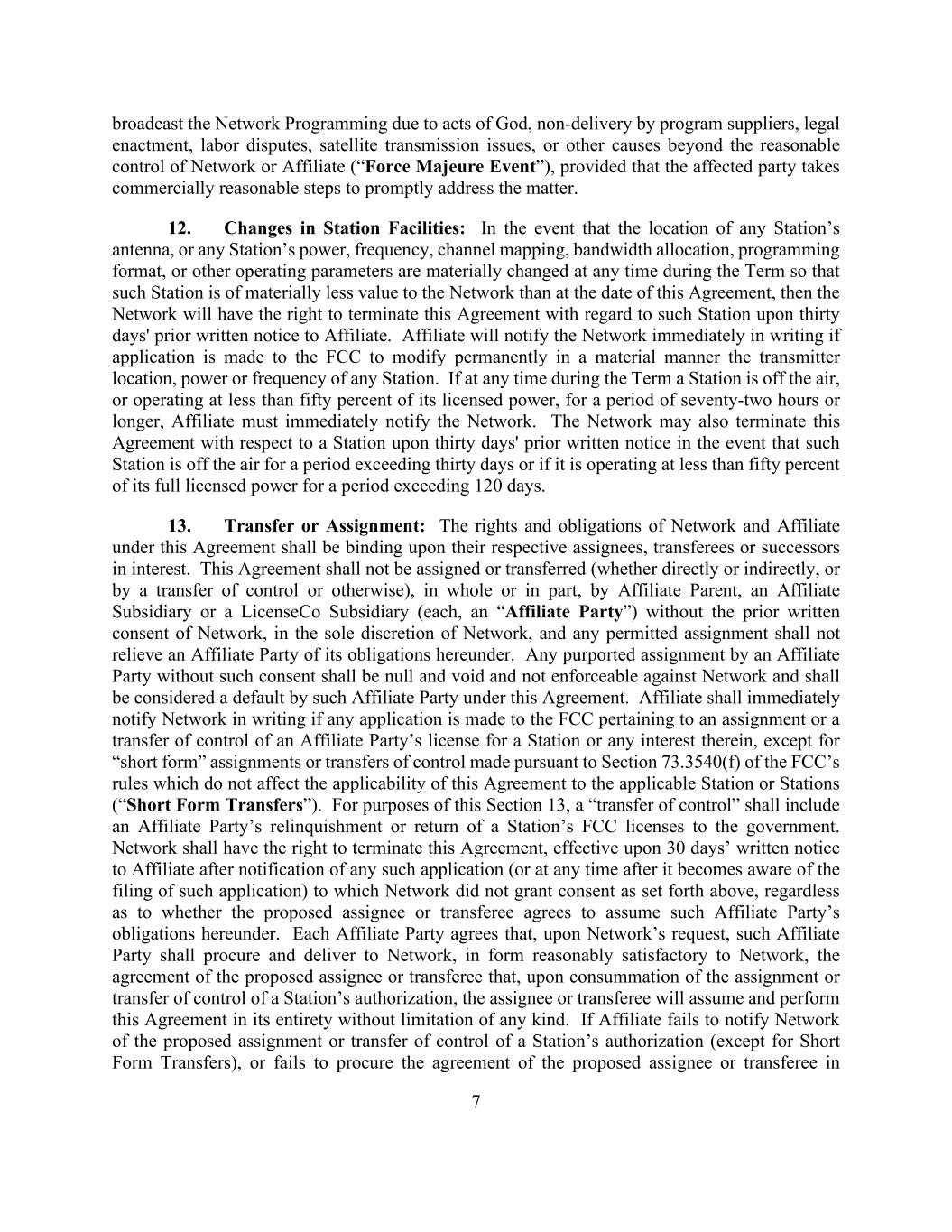7 broadcast the Network Programming due to acts of God, non-delivery by program suppliers, legal enactment, labor disputes, satellite transmission issues, or other causes beyond the reasonable control of Network or Affiliate (“Force Majeure Event”), provided that the affected party takes commercially reasonable steps to promptly address the matter. 12. Changes in Station Facilities: In the event that the location of any Station’s antenna, or any Station’s power, frequency, channel mapping, bandwidth allocation, programming format, or other operating parameters are materially changed at any time during the Term so that such Station is of materially less value to the Network than at the date of this Agreement, then the Network will have the right to terminate this Agreement with regard to such Station upon thirty days' prior written notice to Affiliate. Affiliate will notify the Network immediately in writing if application is made to the FCC to modify permanently in a material manner the transmitter location, power or frequency of any Station. If at any time during the Term a Station is off the air, or operating at less than fifty percent of its licensed power, for a period of seventy-two hours or longer, Affiliate must immediately notify the Network. The Network may also terminate this Agreement with respect to a Station upon thirty days' prior written notice in the event that such Station is off the air for a period exceeding thirty days or if it is operating at less than fifty percent of its full licensed power for a period exceeding 120 days. 13. Transfer or Assignment: The rights and obligations of Network and Affiliate under this Agreement shall be binding upon their respective assignees, transferees or successors in interest. This Agreement shall not be assigned or transferred (whether directly or indirectly, or by a transfer of control or otherwise), in whole or in part, by Affiliate Parent, an Affiliate Subsidiary or a LicenseCo Subsidiary (each, an “Affiliate Party”) without the prior written consent of Network, in the sole discretion of Network, and any permitted assignment shall not relieve an Affiliate Party of its obligations hereunder. Any purported assignment by an Affiliate Party without such consent shall be null and void and not enforceable against Network and shall be considered a default by such Affiliate Party under this Agreement. Affiliate shall immediately notify Network in writing if any application is made to the FCC pertaining to an assignment or a transfer of control of an Affiliate Party’s license for a Station or any interest therein, except for “short form” assignments or transfers of control made pursuant to Section 73.3540(f) of the FCC’s rules which do not affect the applicability of this Agreement to the applicable Station or Stations (“Short Form Transfers”). For purposes of this Section 13, a “transfer of control” shall include an Affiliate Party’s relinquishment or return of a Station’s FCC licenses to the government. Network shall have the right to terminate this Agreement, effective upon 30 days’ written notice to Affiliate after notification of any such application (or at any time after it becomes aware of the filing of such application) to which Network did not grant consent as set forth above, regardless as to whether the proposed assignee or transferee agrees to assume such Affiliate Party’s obligations hereunder. Each Affiliate Party agrees that, upon Network’s request, such Affiliate Party shall procure and deliver to Network, in form reasonably satisfactory to Network, the agreement of the proposed assignee or transferee that, upon consummation of the assignment or transfer of control of a Station’s authorization, the assignee or transferee will assume and perform this Agreement in its entirety without limitation of any kind. If Affiliate fails to notify Network of the proposed assignment or transfer of control of a Station’s authorization (except for Short Form Transfers), or fails to procure the agreement of the proposed assignee or transferee in