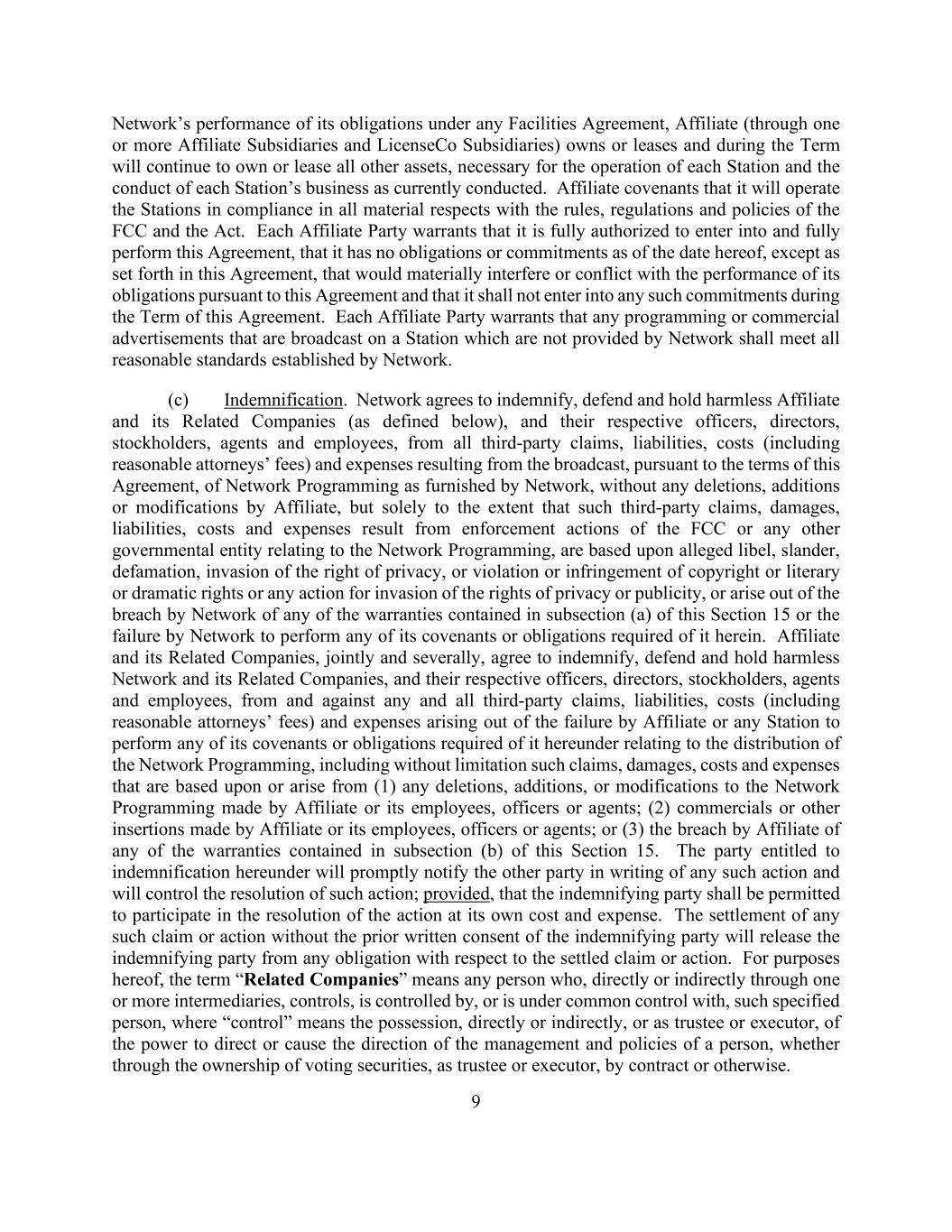 9 Network’s performance of its obligations under any Facilities Agreement, Affiliate (through one or more Affiliate Subsidiaries and LicenseCo Subsidiaries) owns or leases and during the Term will continue to own or lease all other assets, necessary for the operation of each Station and the conduct of each Station’s business as currently conducted. Affiliate covenants that it will operate the Stations in compliance in all material respects with the rules, regulations and policies of the FCC and the Act. Each Affiliate Party warrants that it is fully authorized to enter into and fully perform this Agreement, that it has no obligations or commitments as of the date hereof, except as set forth in this Agreement, that would materially interfere or conflict with the performance of its obligations pursuant to this Agreement and that it shall not enter into any such commitments during the Term of this Agreement. Each Affiliate Party warrants that any programming or commercial advertisements that are broadcast on a Station which are not provided by Network shall meet all reasonable standards established by Network. (c) Indemnification. Network agrees to indemnify, defend and hold harmless Affiliate and its Related Companies (as defined below), and their respective officers, directors, stockholders, agents and employees, from all third-party claims, liabilities, costs (including reasonable attorneys’ fees) and expenses resulting from the broadcast, pursuant to the terms of this Agreement, of Network Programming as furnished by Network, without any deletions, additions or modifications by Affiliate, but solely to the extent that such third-party claims, damages, liabilities, costs and expenses result from enforcement actions of the FCC or any other governmental entity relating to the Network Programming, are based upon alleged libel, slander, defamation, invasion of the right of privacy, or violation or infringement of copyright or literary or dramatic rights or any action for invasion of the rights of privacy or publicity, or arise out of the breach by Network of any of the warranties contained in subsection (a) of this Section 15 or the failure by Network to perform any of its covenants or obligations required of it herein. Affiliate and its Related Companies, jointly and severally, agree to indemnify, defend and hold harmless Network and its Related Companies, and their respective officers, directors, stockholders, agents and employees, from and against any and all third-party claims, liabilities, costs (including reasonable attorneys’ fees) and expenses arising out of the failure by Affiliate or any Station to perform any of its covenants or obligations required of it hereunder relating to the distribution of the Network Programming, including without limitation such claims, damages, costs and expenses that are based upon or arise from (1) any deletions, additions, or modifications to the Network Programming made by Affiliate or its employees, officers or agents; (2) commercials or other insertions made by Affiliate or its employees, officers or agents; or (3) the breach by Affiliate of any of the warranties contained in subsection (b) of this Section 15. The party entitled to indemnification hereunder will promptly notify the other party in writing of any such action and will control the resolution of such action; provided, that the indemnifying party shall be permitted to participate in the resolution of the action at its own cost and expense. The settlement of any such claim or action without the prior written consent of the indemnifying party will release the indemnifying party from any obligation with respect to the settled claim or action. For purposes hereof, the term “Related Companies” means any person who, directly or indirectly through one or more intermediaries, controls, is controlled by, or is under common control with, such specified person, where “control” means the possession, directly or indirectly, or as trustee or executor, of the power to direct or cause the direction of the management and policies of a person, whether through the ownership of voting securities, as trustee or executor, by contract or otherwise.
