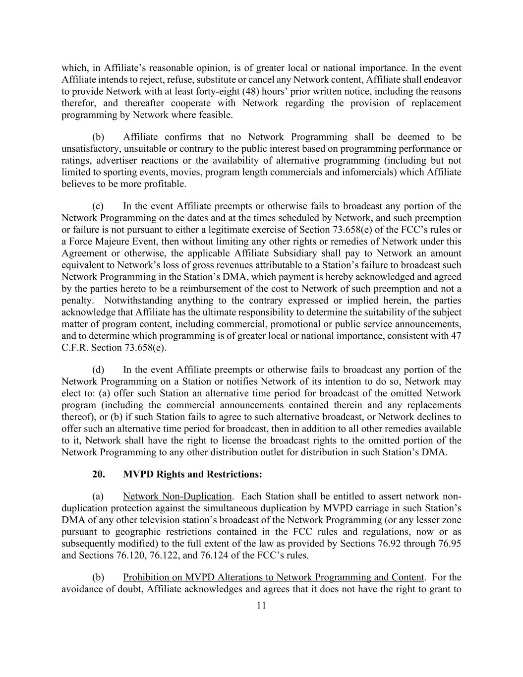 11 which, in Affiliate’s reasonable opinion, is of greater local or national importance. In the event Affiliate intends to reject, refuse, substitute or cancel any Network content, Affiliate shall endeavor to provide Network with at least forty-eight (48) hours’ prior written notice, including the reasons therefor, and thereafter cooperate with Network regarding the provision of replacement programming by Network where feasible. (b) Affiliate confirms that no Network Programming shall be deemed to be unsatisfactory, unsuitable or contrary to the public interest based on programming performance or ratings, advertiser reactions or the availability of alternative programming (including but not limited to sporting events, movies, program length commercials and infomercials) which Affiliate believes to be more profitable. (c) In the event Affiliate preempts or otherwise fails to broadcast any portion of the Network Programming on the dates and at the times scheduled by Network, and such preemption or failure is not pursuant to either a legitimate exercise of Section 73.658(e) of the FCC’s rules or a Force Majeure Event, then without limiting any other rights or remedies of Network under this Agreement or otherwise, the applicable Affiliate Subsidiary shall pay to Network an amount equivalent to Network’s loss of gross revenues attributable to a Station’s failure to broadcast such Network Programming in the Station’s DMA, which payment is hereby acknowledged and agreed by the parties hereto to be a reimbursement of the cost to Network of such preemption and not a penalty. Notwithstanding anything to the contrary expressed or implied herein, the parties acknowledge that Affiliate has the ultimate responsibility to determine the suitability of the subject matter of program content, including commercial, promotional or public service announcements, and to determine which programming is of greater local or national importance, consistent with 47 C.F.R. Section 73.658(e). (d) In the event Affiliate preempts or otherwise fails to broadcast any portion of the Network Programming on a Station or notifies Network of its intention to do so, Network may elect to: (a) offer such Station an alternative time period for broadcast of the omitted Network program (including the commercial announcements contained therein and any replacements thereof), or (b) if such Station fails to agree to such alternative broadcast, or Network declines to offer such an alternative time period for broadcast, then in addition to all other remedies available to it, Network shall have the right to license the broadcast rights to the omitted portion of the Network Programming to any other distribution outlet for distribution in such Station’s DMA. 20. MVPD Rights and Restrictions: (a) Network Non-Duplication. Each Station shall be entitled to assert network non- duplication protection against the simultaneous duplication by MVPD carriage in such Station’s DMA of any other television station’s broadcast of the Network Programming (or any lesser zone pursuant to geographic restrictions contained in the FCC rules and regulations, now or as subsequently modified) to the full extent of the law as provided by Sections 76.92 through 76.95 and Sections 76.120, 76.122, and 76.124 of the FCC’s rules. (b) Prohibition on MVPD Alterations to Network Programming and Content. For the avoidance of doubt, Affiliate acknowledges and agrees that it does not have the right to grant to
